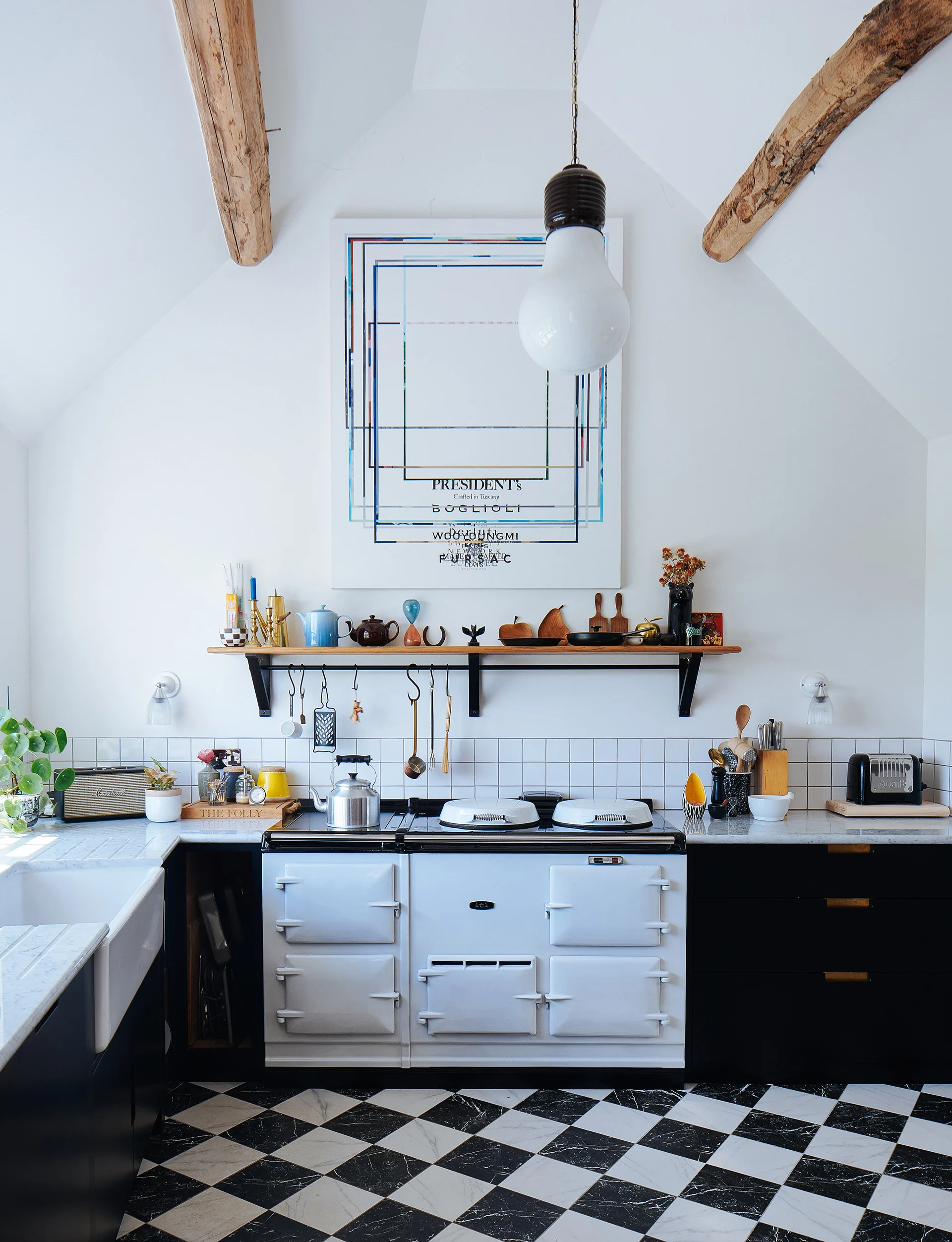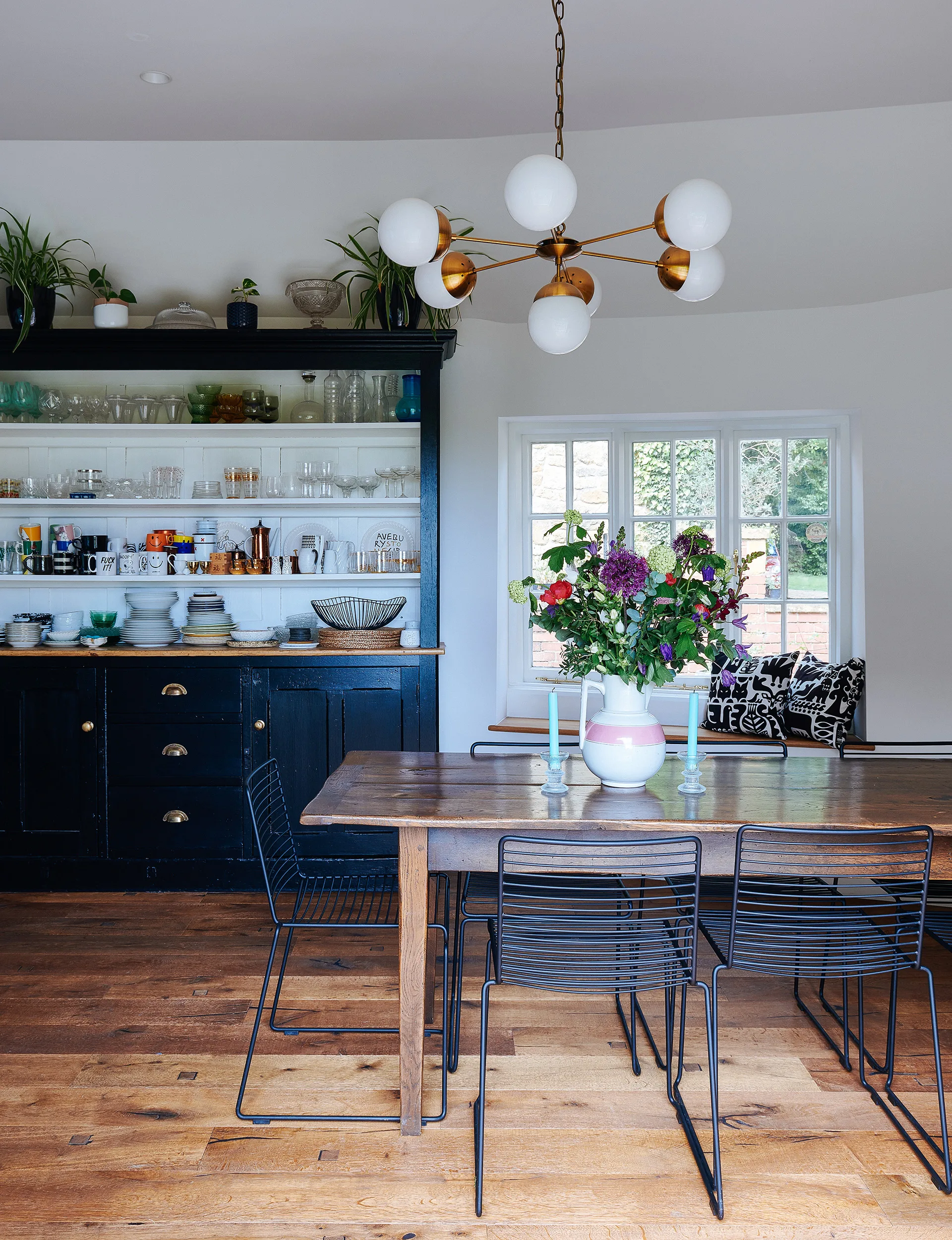 Emily took her design cues from the rural location of the house: a white Aga stove has been teamed with black units with brass handles, a farmhouse-style wooden table and a vintage black-painted dresser displaying crockery and glassware.