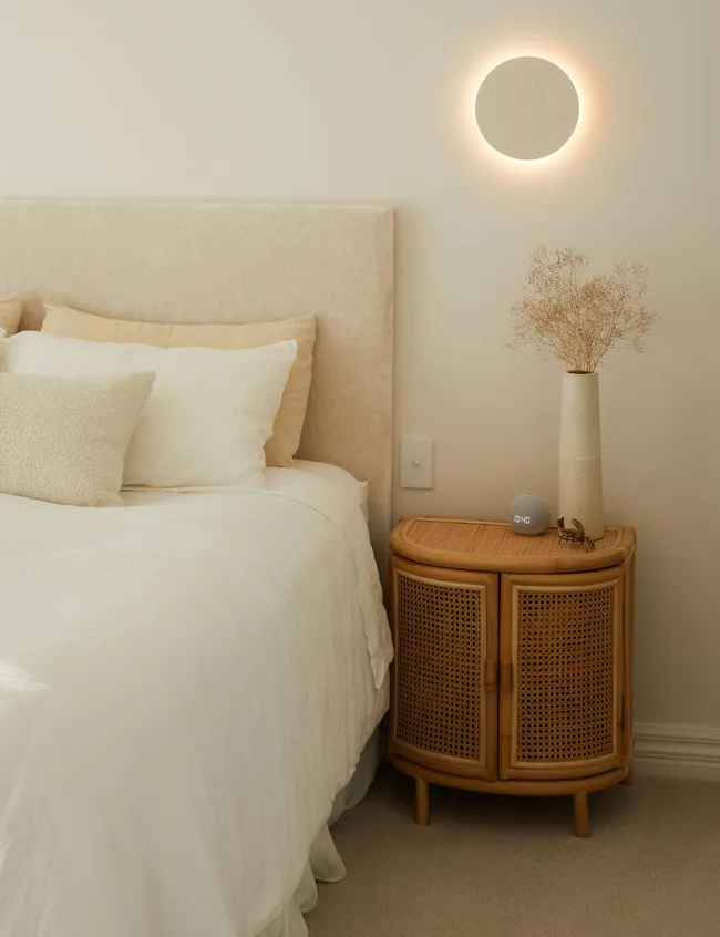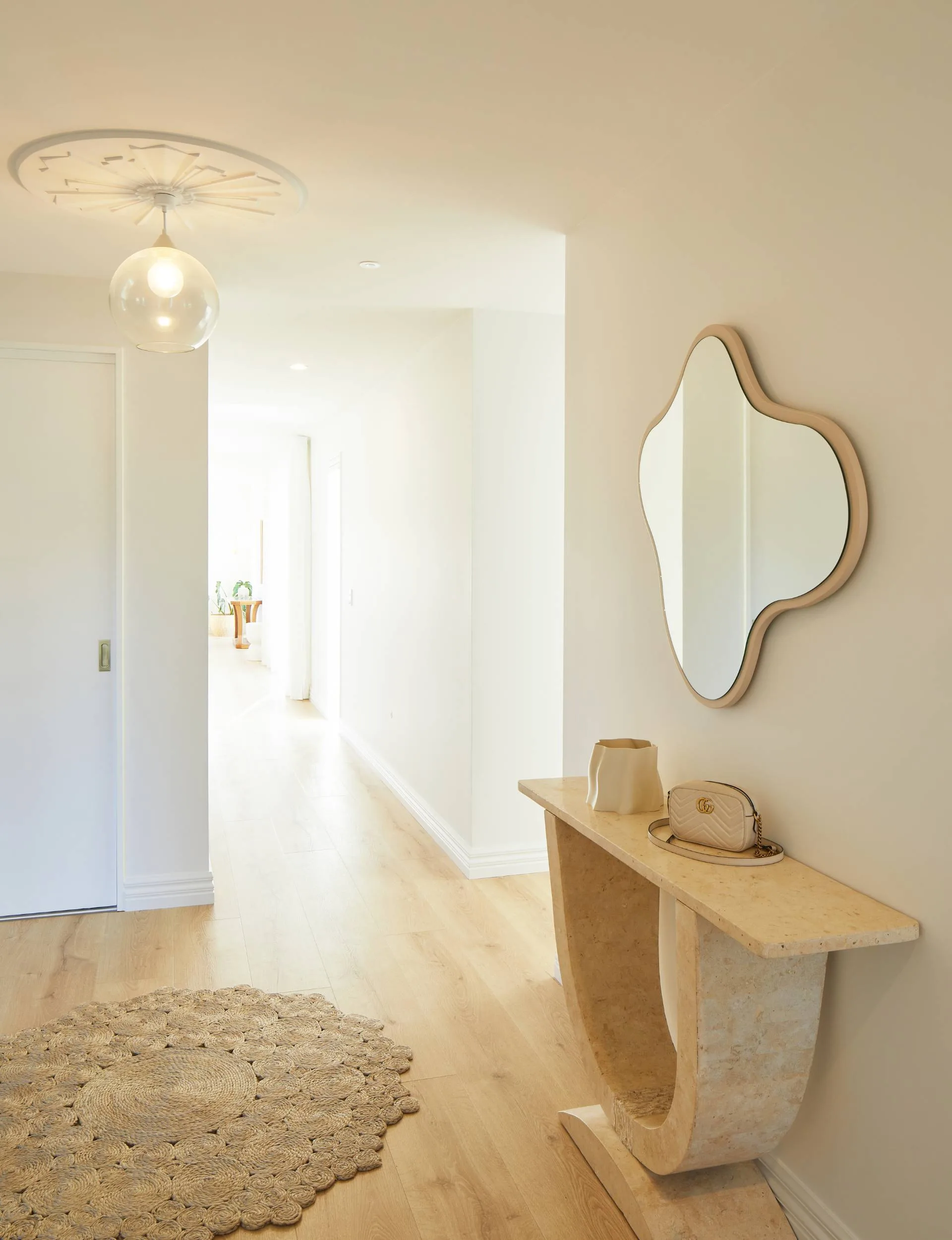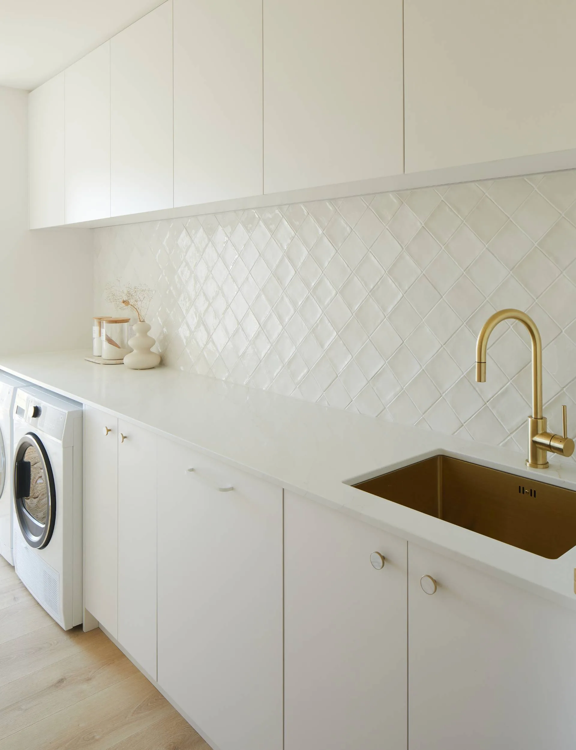 “I kept everything neutral as I didn’t want to hate a coloured kitchen in 10 years, so we played it safe with key components. In every design style I have evolved through, I have always tried to create a warm, inviting, cosy home. This home has a lot of honey timber tones with warm neutrals. A lot of the timber is oak, as that is my favourite and a classic. For a while, I considered warm walnut as an alternative. I very much wanted herringbone walnut flooring, but I just couldn’t make that leap from what I knew I really loved, and would continue to love long-term,” she shares.