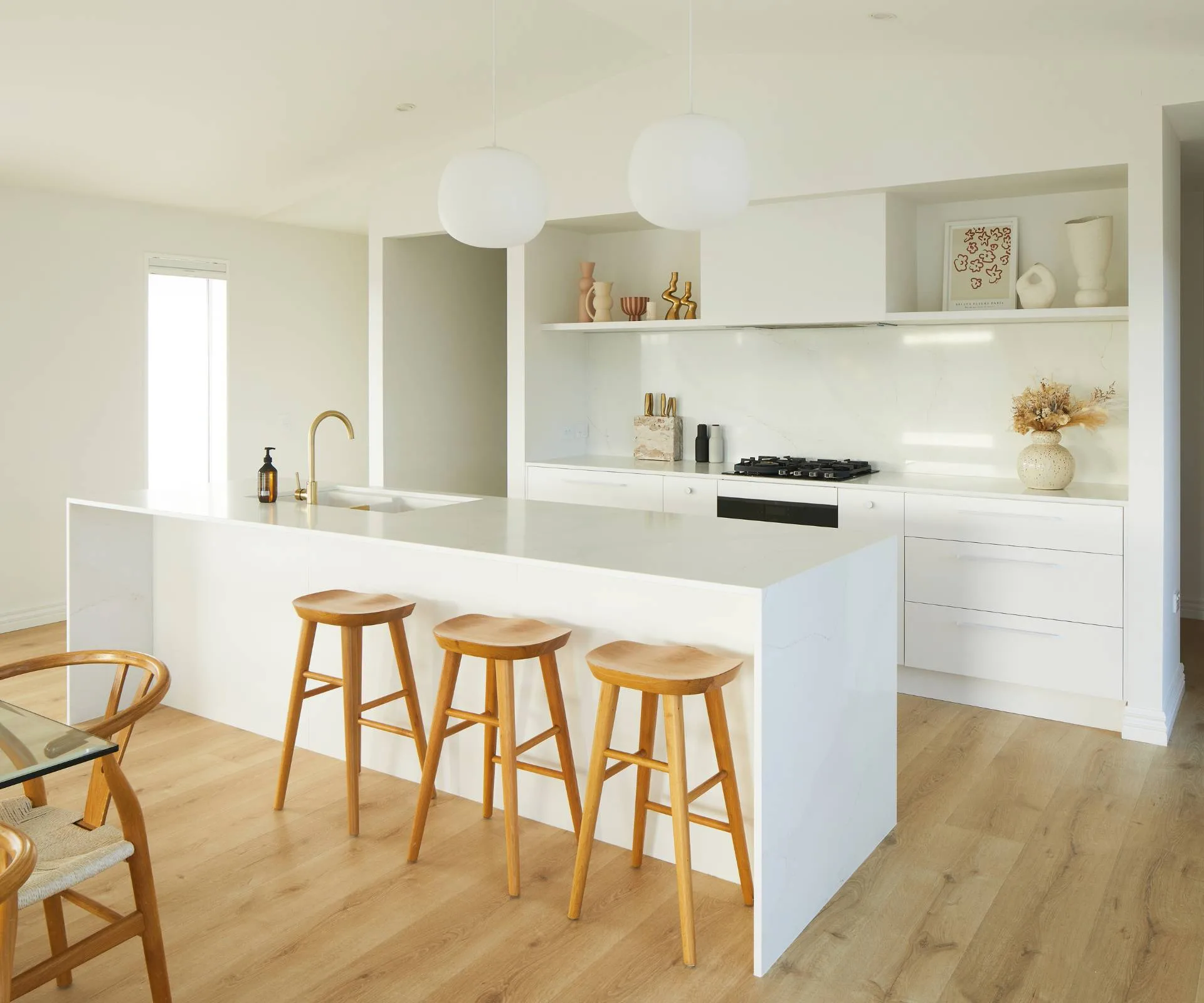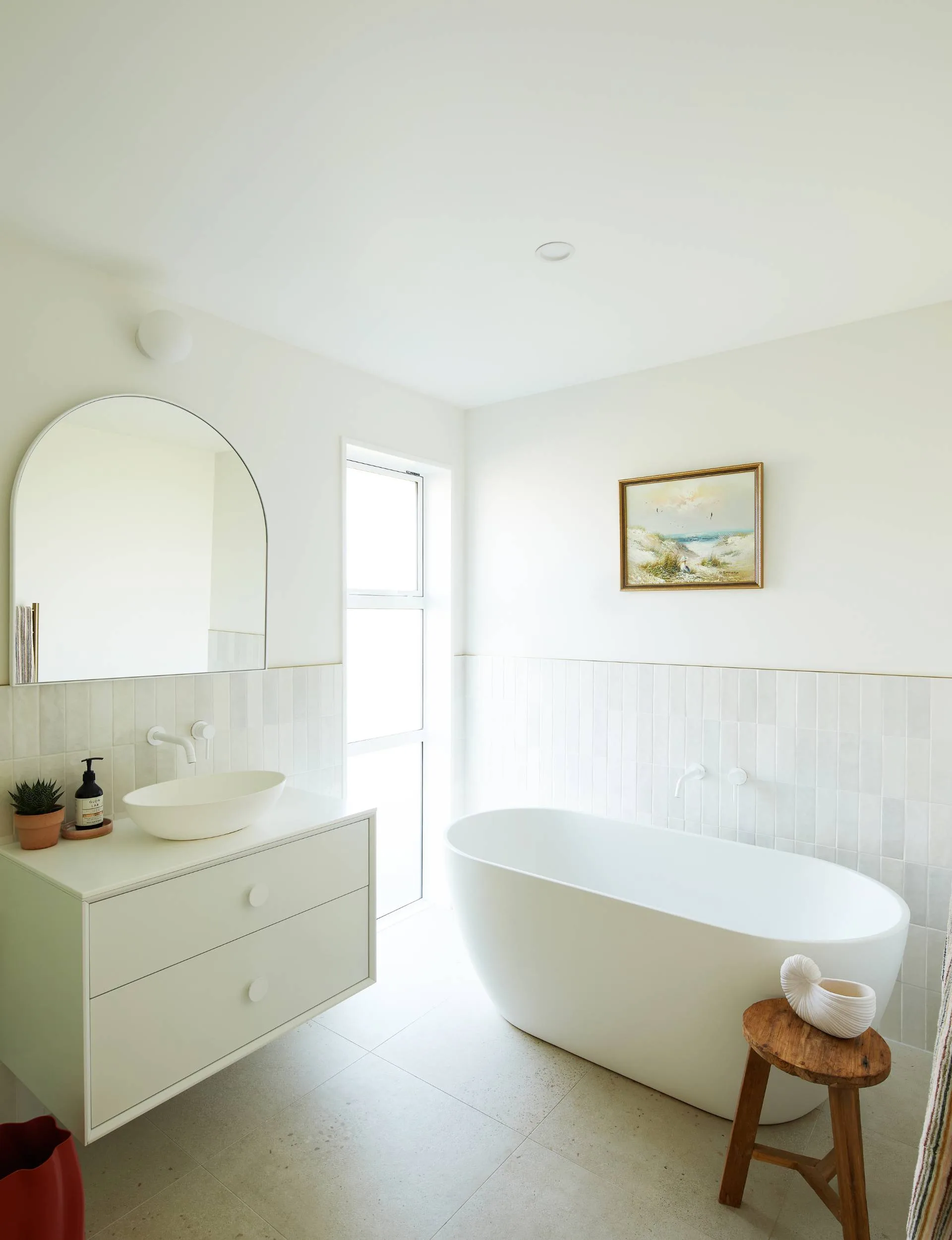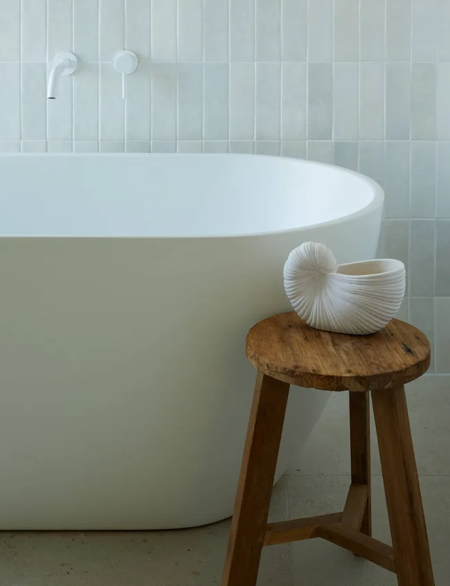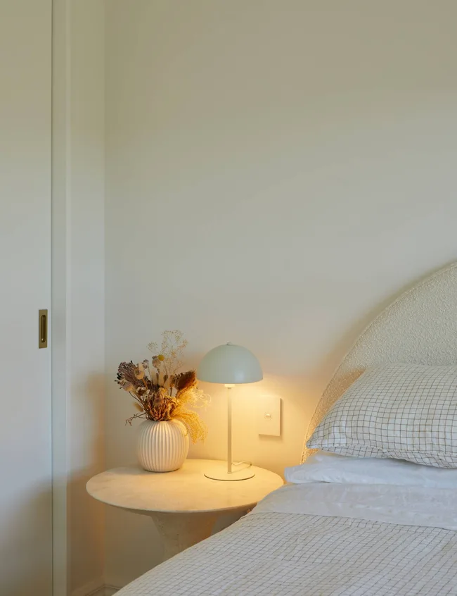 “I kept everything neutral as I didn’t want to hate a coloured kitchen in 10 years, so we played it safe with key components. In every design style I have evolved through, I have always tried to create a warm, inviting, cosy home. This home has a lot of honey timber tones with warm neutrals. A lot of the timber is oak, as that is my favourite and a classic. For a while, I considered warm walnut as an alternative. I very much wanted herringbone walnut flooring, but I just couldn’t make that leap from what I knew I really loved, and would continue to love long-term,” she shares.