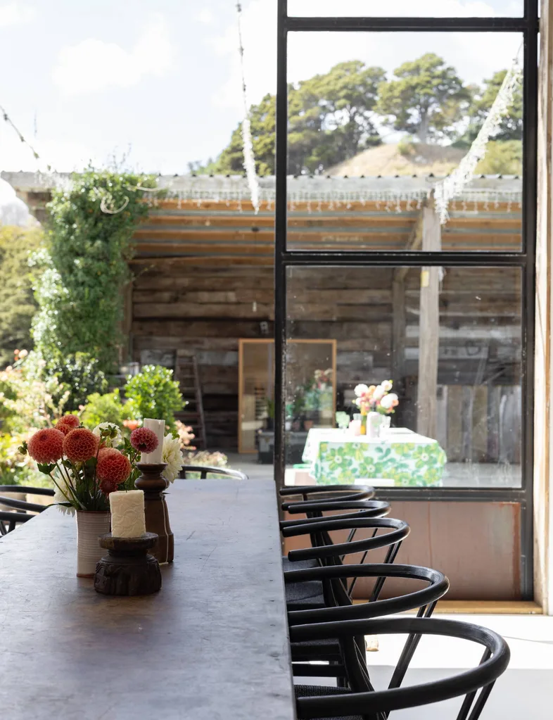 New and bespoke finishes, like the pair of brass doors and the enormous steel-framed sliders, sit alongside reclaimed treasures, such as the French draper’s counter that serves as a kitchen island and the raw timbers (seen around the enormous doorways to the patio), which Peter salvaged from a falling-down barn in Whakatāne.