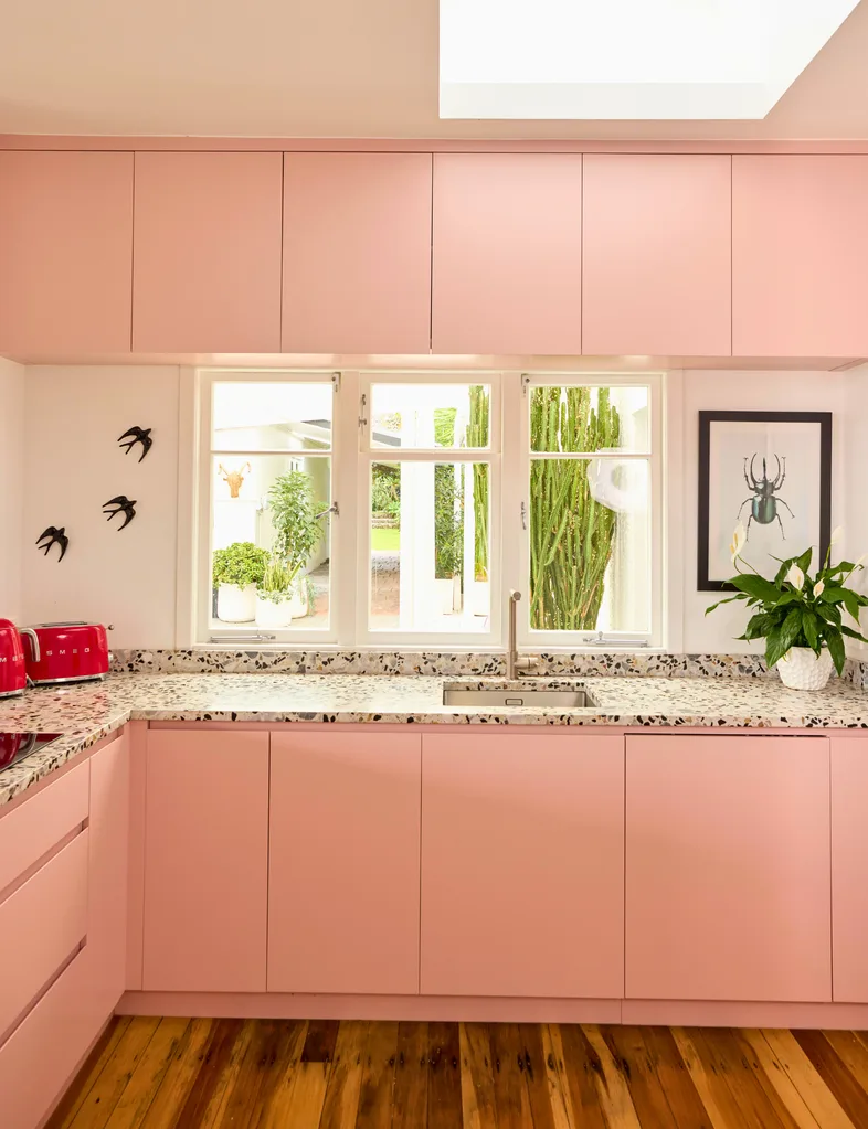 One of the most captivating spaces is Erina’s kitchen, a blend of colour and pattern that remains functional and designed by her. “I wanted something unique and interesting,” she says. “I had considered a yellow kitchen because we previously had a yellow feature wall and curtains there. In the end, I chose Aalto’s Half Epiphany Pink, which is a soft, bright but muted beautiful pink. We paired it with one white wall to avoid it being too overpowering.”