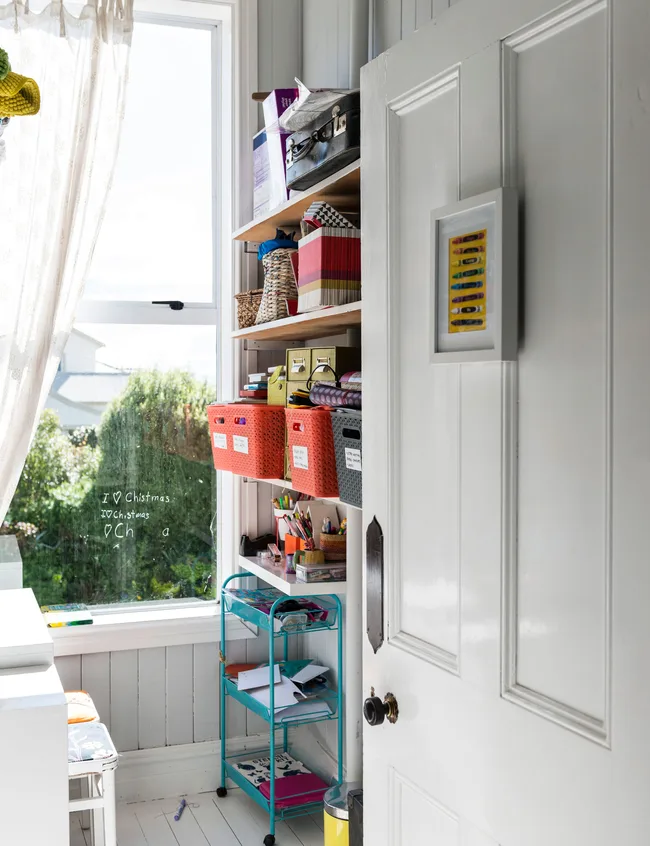 The kitchen straddles the boundary between the original Oamaru villa and an extension, which has created interesting beam angles and ceiling heights. Splashes of bright colour and playfulness are found throughout the home.