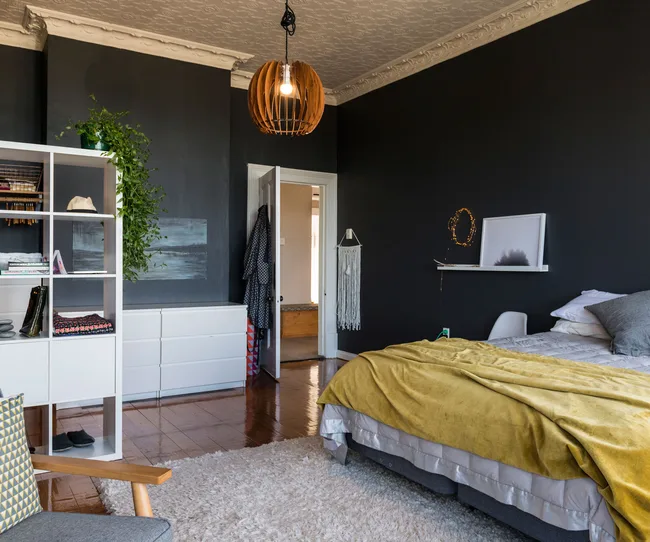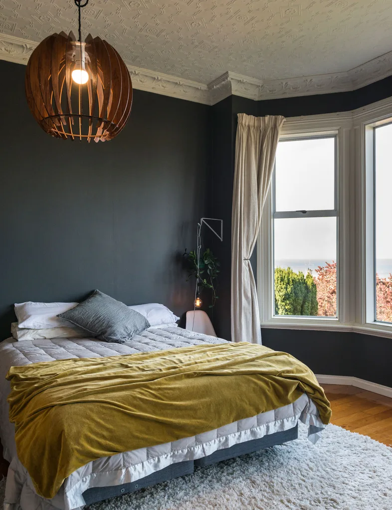 Originally the master bedroom was covered in very pale cream wallpaper, but as a result the large-scale room just felt too vast. “We chose Resene Karen Walker ‘Fuscous Grey’ for its cocooning effect. It now feels cosy and intimate, and not at all too dark with the amazing morning light that streams in from the horizon,” says Helen.