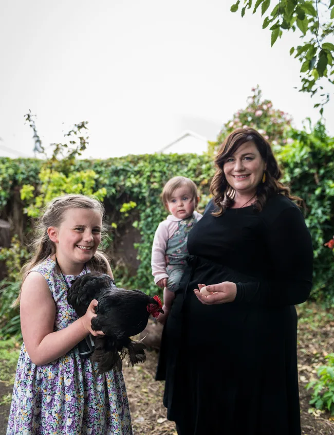 Michael Duddin, stock market analyst), Helen Riley-Duddin, designer and owner of Tinch and curator of Guild in Dunedin, Jemima, Rowan and Sylviem, plus Miffy the pup, Minnie the cat and four bantams.