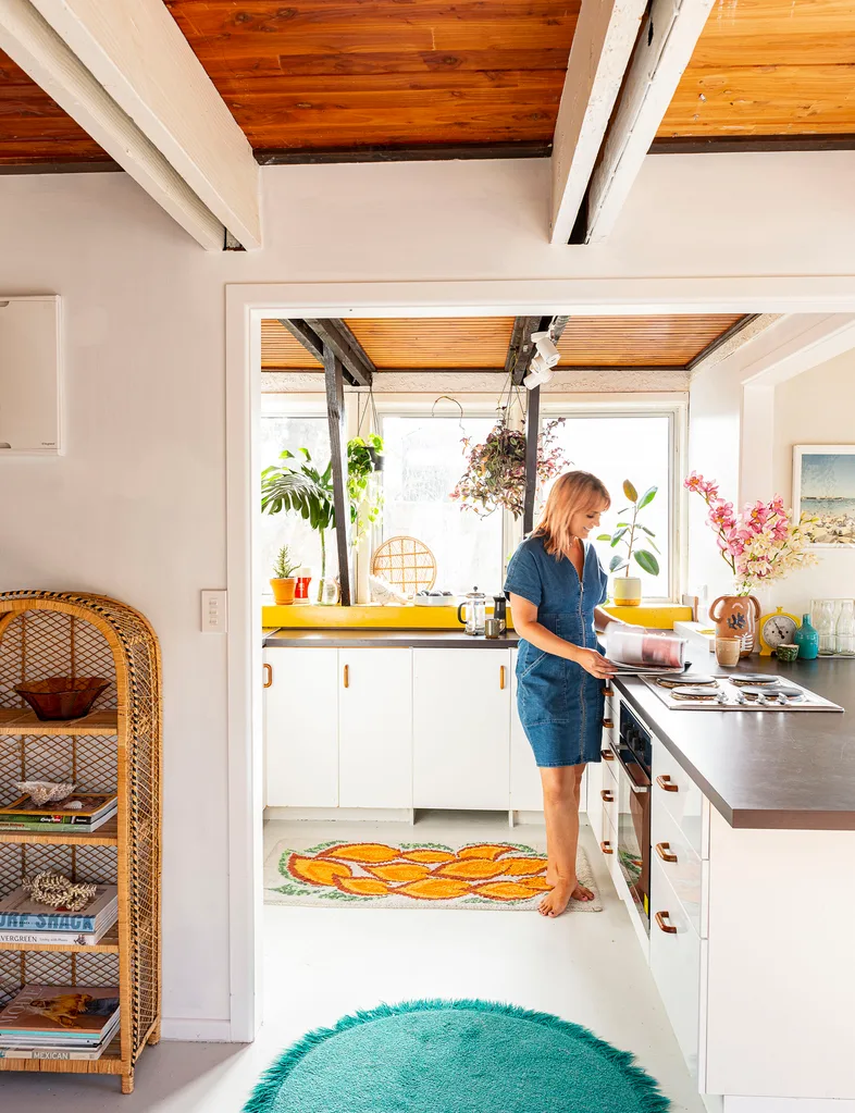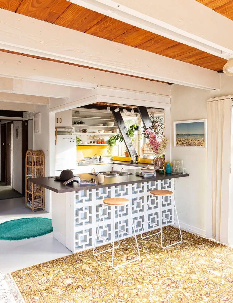 The interior was given a fresh coat of white paint to brighten it up. Next, the couple tore down a half-wall to create an open-plan kitchen and living space. In its place, they built a breakfast bar on a decorative breeze-block base, which not only links to the wall outside but also fits perfectly with the retro charm of the kitchen with its open shelves and original yolk-yellow splashback.