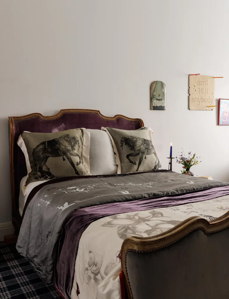 Nicola expresses her many interests in her hand-printed textiles, which depict illustrations of vegetables, vines, vintage ladies, violins and silverware. She’s been finessing her craft since the 1980s, when she and her sister took over Oblio’s restaurant on Ponsonby Road. They modernised it, turning it from a fine-dining establishment into a bistro. “I didn’t like all the stark-white tablecloths, so I decided to print my own,” says Nicola. “Then I sold them individually so I could cover the costs of the screens and having the tablecloths sewn.” Eventually, she began wholesaling tablecloths to the likes of Tessuti.