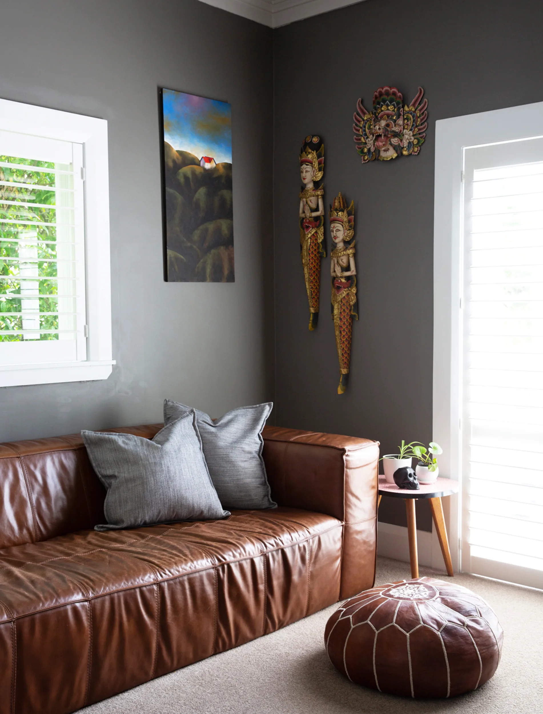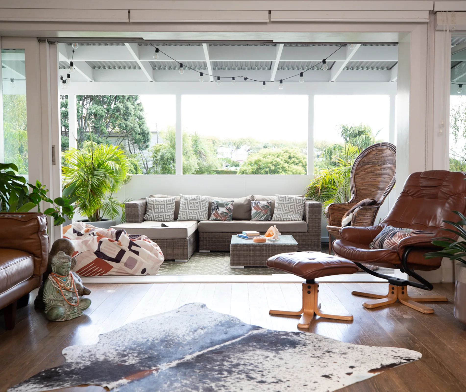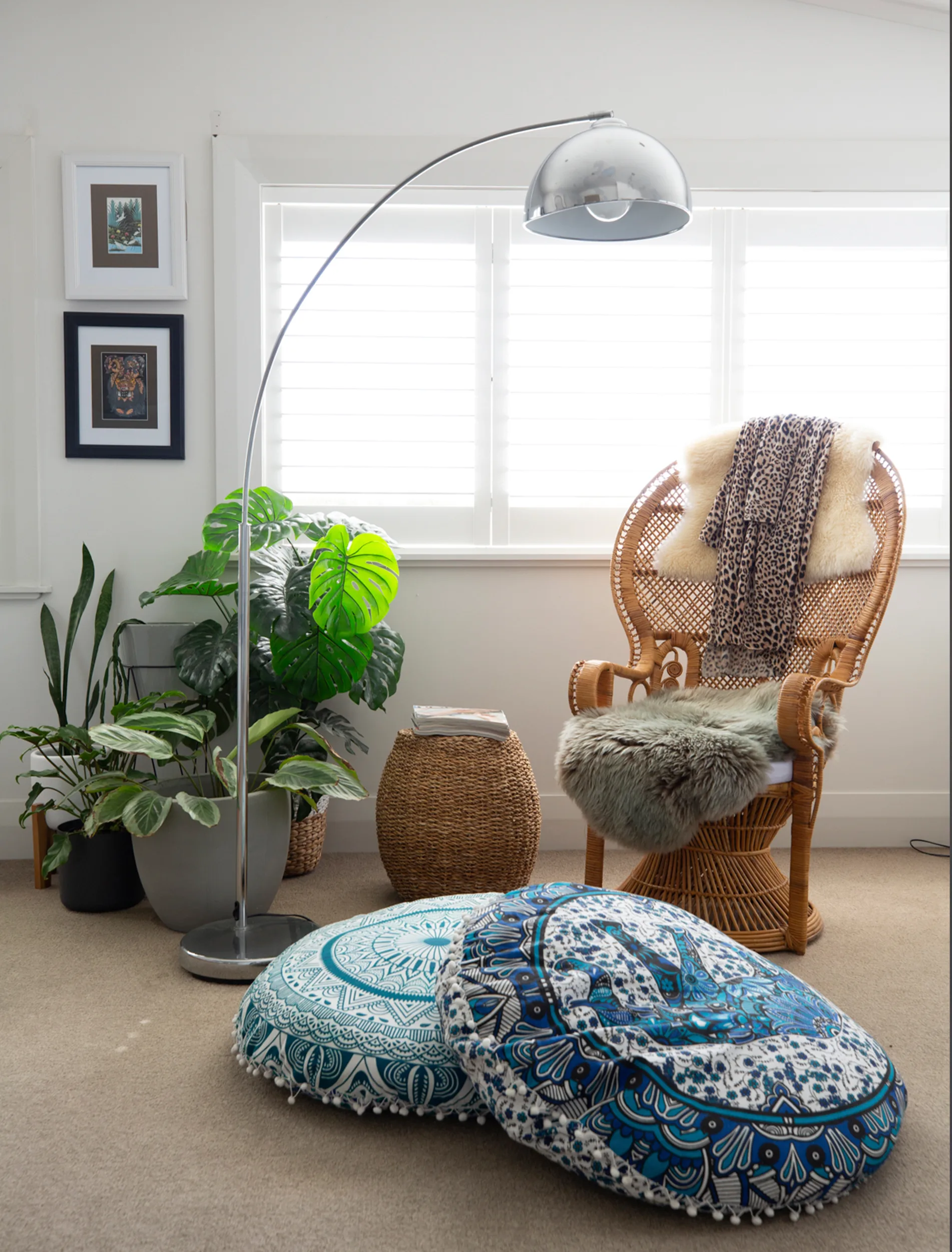 The home is a treasure trove of eclectic finds, including vintage prints sourced from antique shops, street art created by friends and furniture pieces inspired by time spent in Bali, Thailand and Morocco. The collection of Buddhas look right at home perched on the leadlight window sills and wooden shelves, as does the glamorous rattan peacock chairs on the deck and in the bedroom.