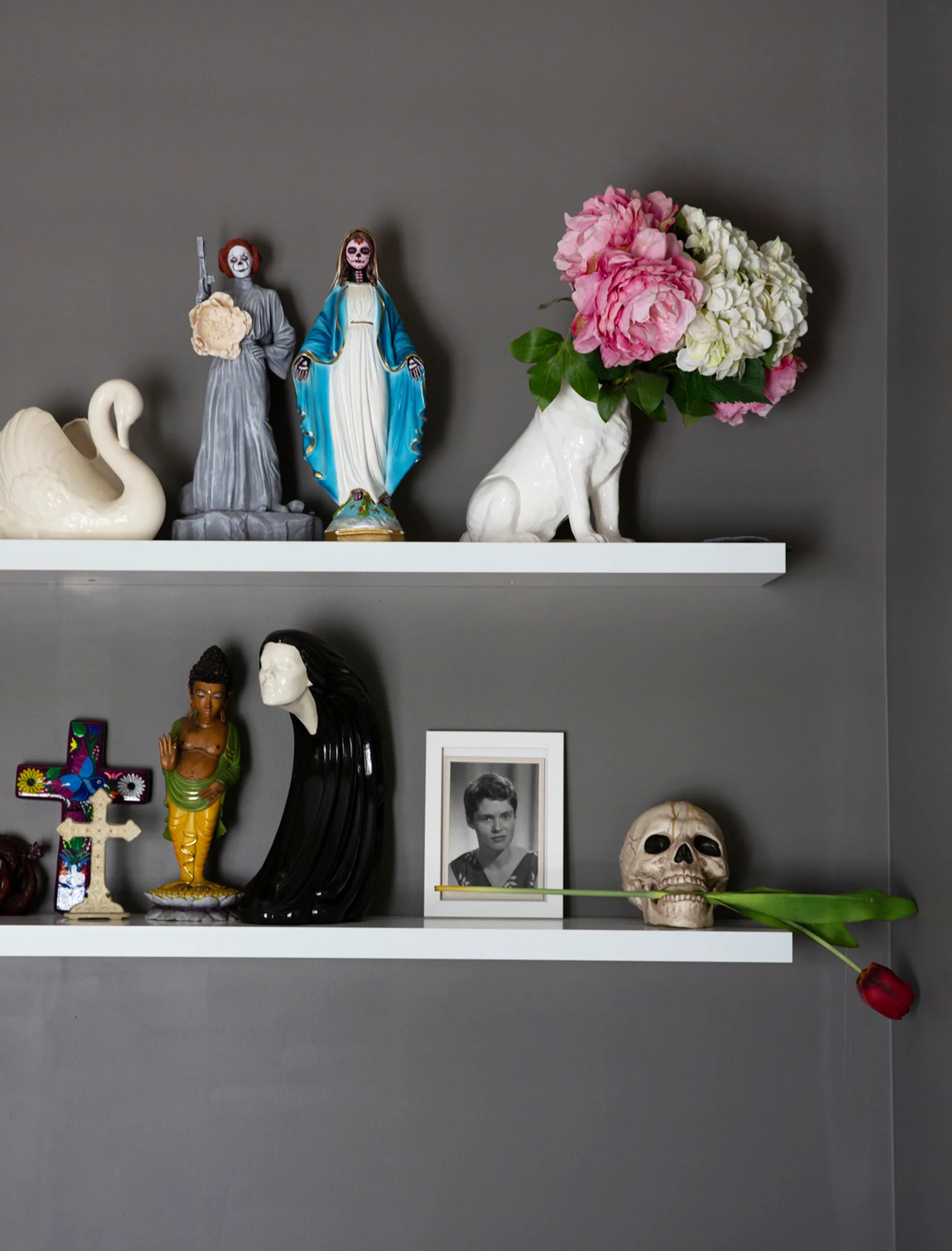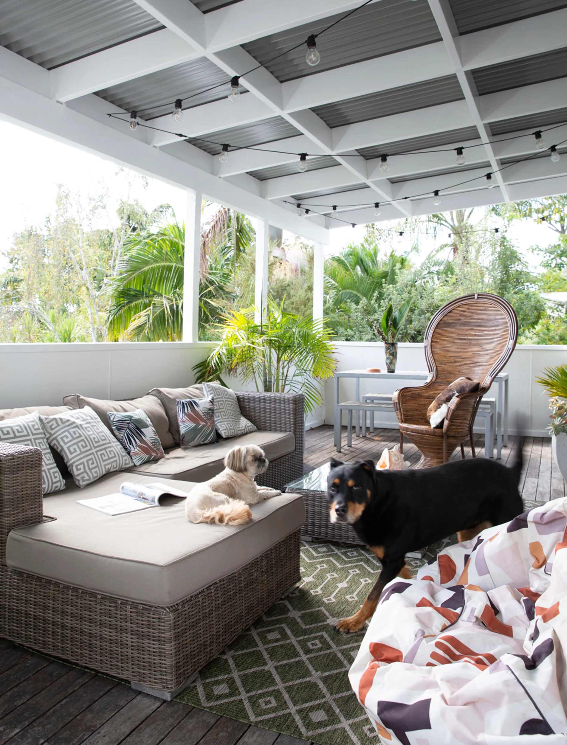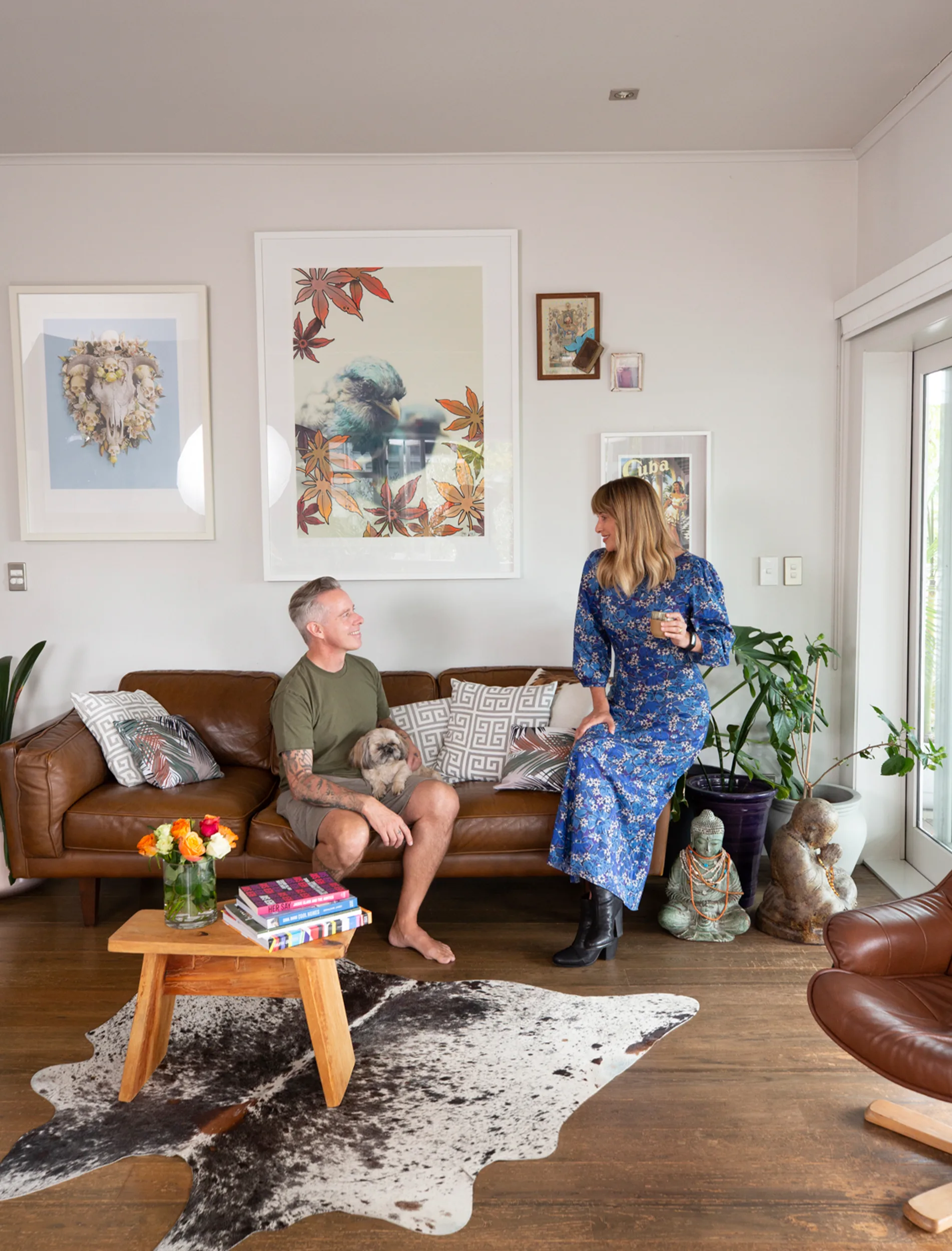The home is a treasure trove of eclectic finds, including vintage prints sourced from antique shops, street art created by friends and furniture pieces inspired by time spent in Bali, Thailand and Morocco. The collection of Buddhas look right at home perched on the leadlight window sills and wooden shelves, as does the glamorous rattan peacock chairs on the deck and in the bedroom.