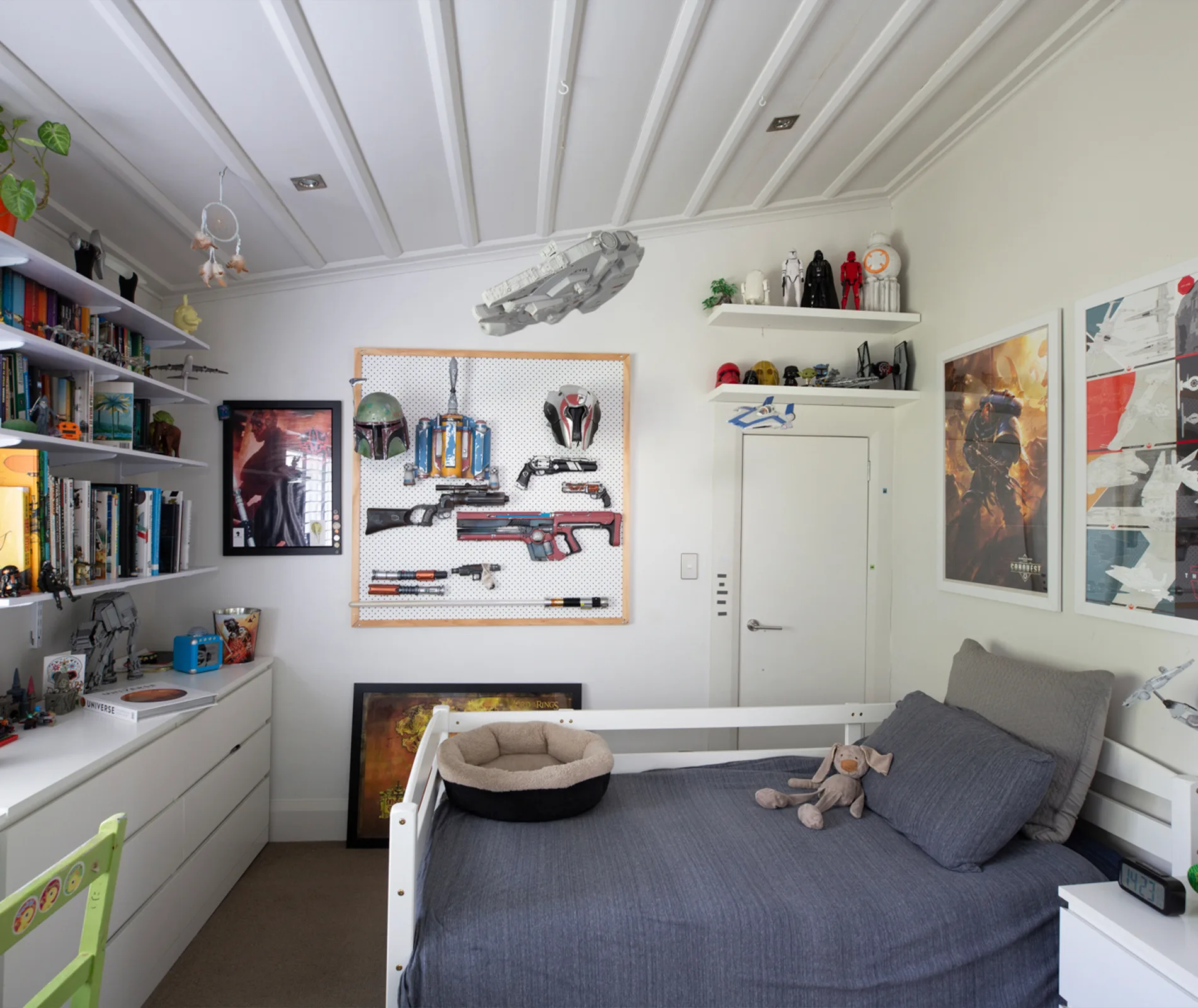 The beauty of this five-bedroom, three-storey home is its 200sqm living space – there’s plenty of room for each member of the family to find solace. Although Helene often prefers to sit at the dining table and work with the green outlook as her backdrop, she has a separate office upstairs with its own veranda, should she need extra peace and quiet. The main living level has a small coat room that Jooles has turned into his workshop – it’s in here, he and Wolf create Star Wars and video game-inspired cosplay outfits. Downstairs has a self-contained apartment for guests.