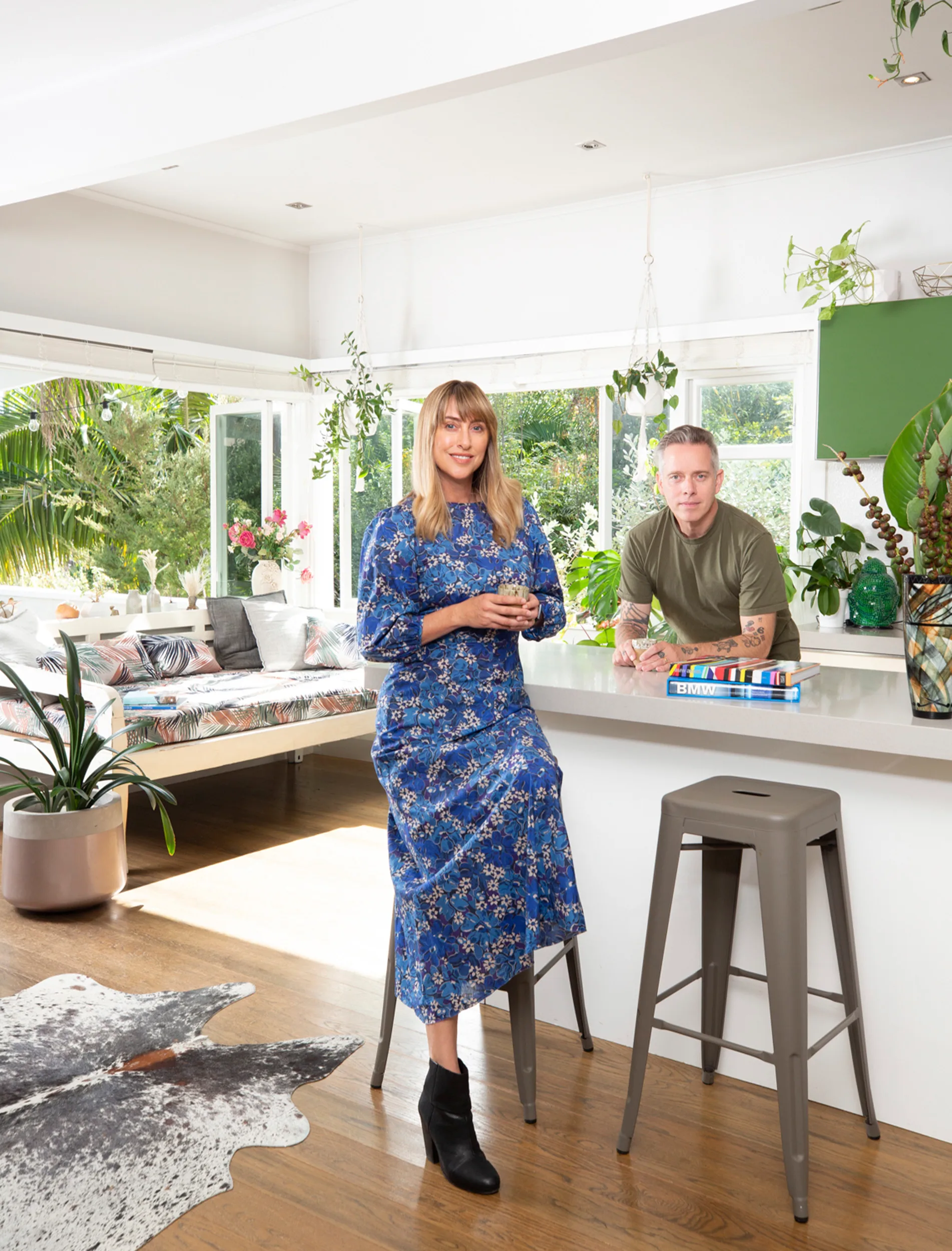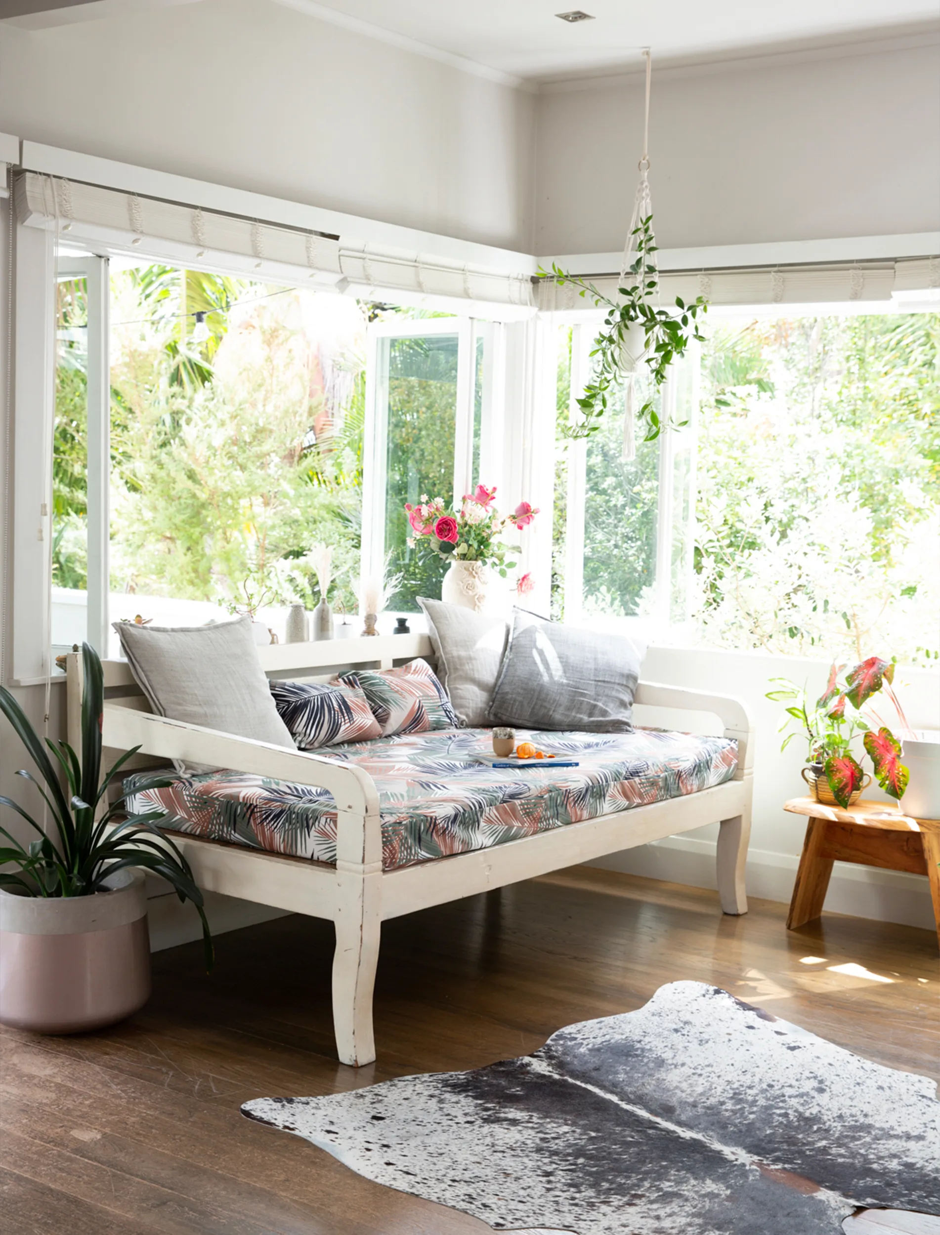 Memorable holidays also inspired the living room daybed – which Jooles reupholstered in a resort-style fabric – and all the plant life, whether hanging from the ceiling or positioned in pots on the wooden floors.