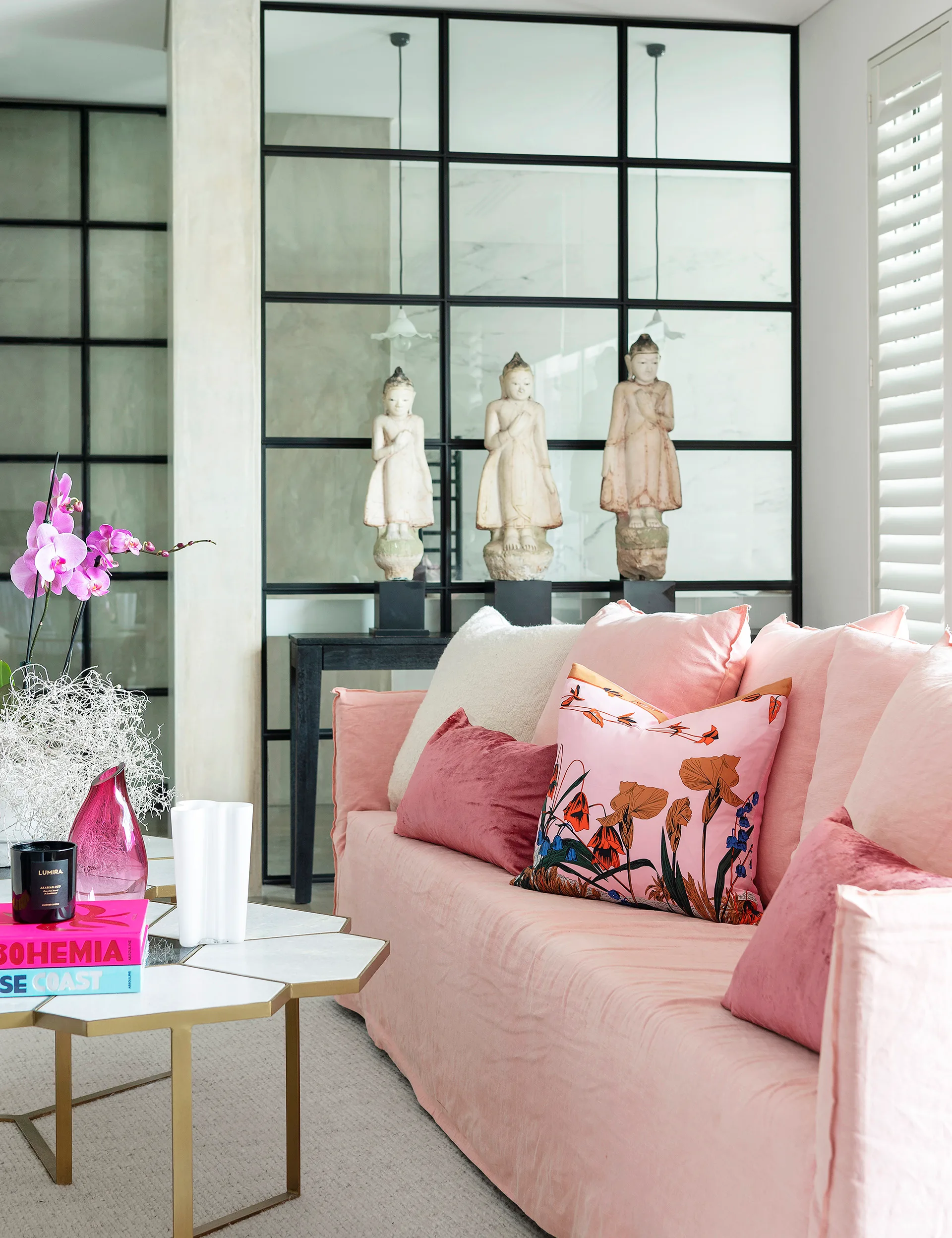 Throughout, consistent splashes of Jill’s favourite hues – emerald green and blush pink – come to the fore, while expanses of glass usher in light and views. There are also many eye-catching design elements, including the arched walkway under the stairs and the monumental yet retractable timber and glass door (designed by Perry) that makes an indelible impression in the foyer. “That door is such a feature,” says Jill, “as are the recycled teak doors at the entrance to the courtyard.”