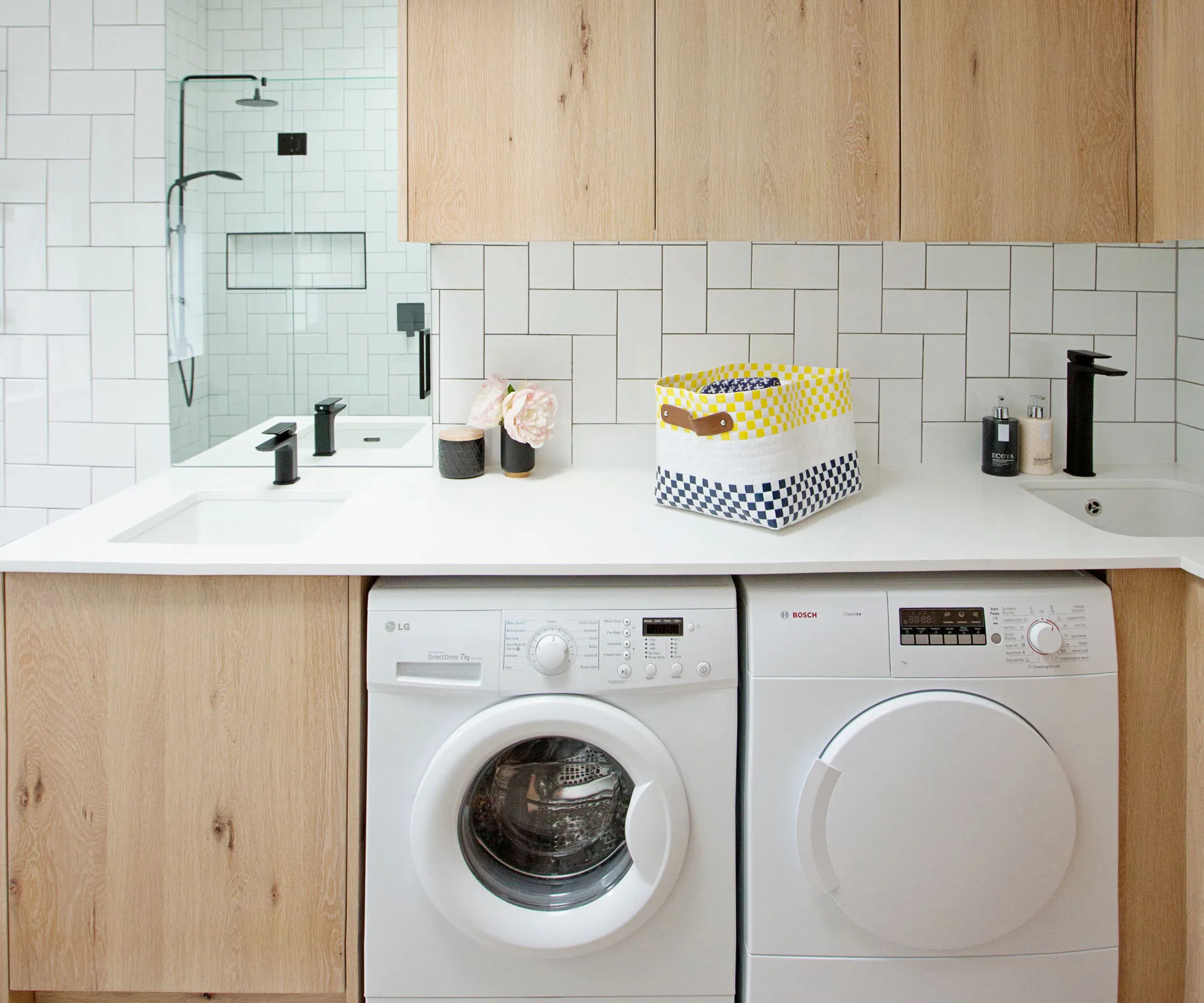 To brighten and warm up the space, increase storage, add a shower and bath, and have a bathroom basin and cabinet integrated into a single countertop which transitions through to the laundry.