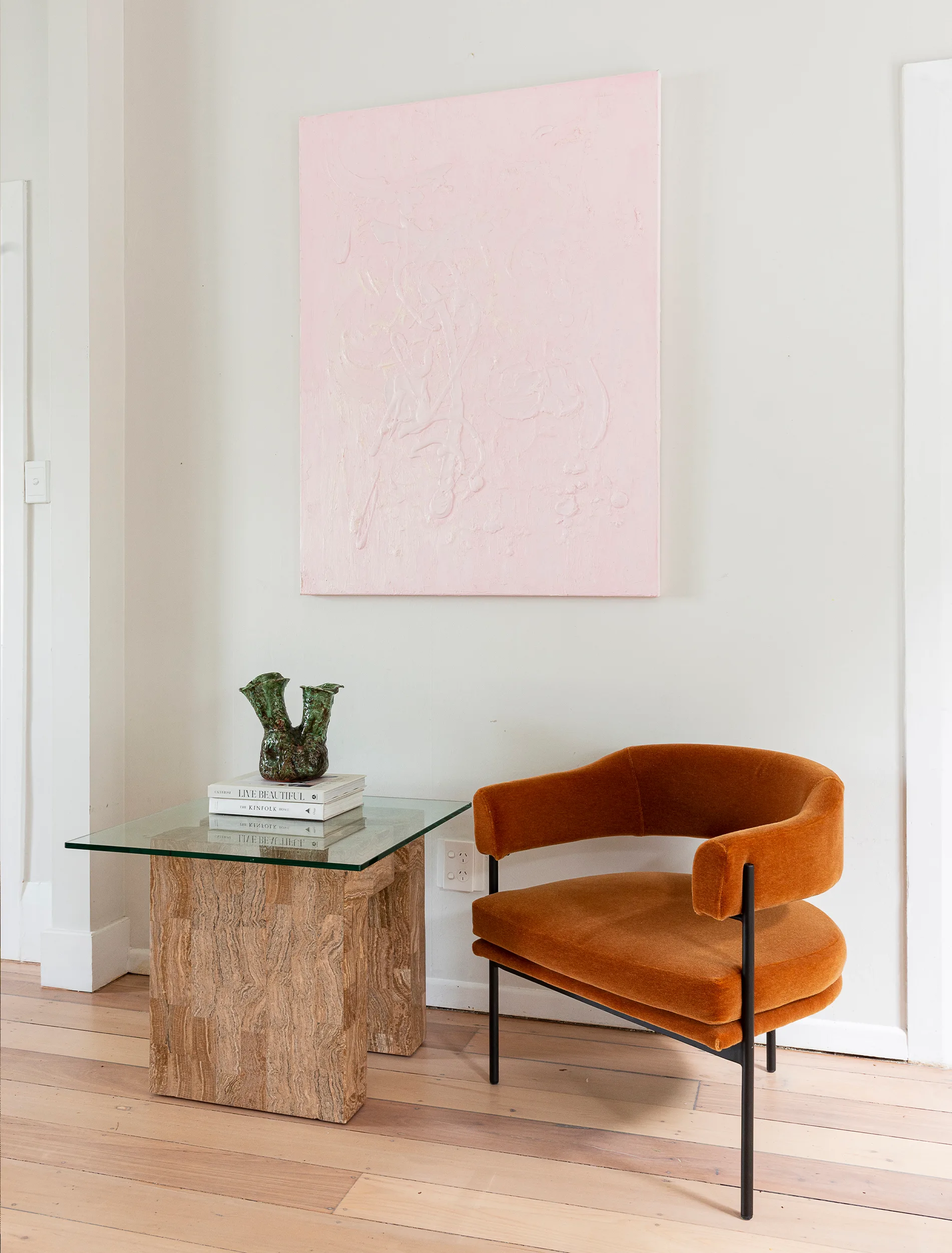 “My lamp from Babelogue in the dining room was a good vintage find. It is like a piece of art to me. It is so unique; I have never seen anything like it. I’m a lover of light and I turn it on day and night because I love the ambience it gives my home. I also adore my side table from Babelogue. I love the mix of travertine and glass – natural materials are so perfectly imperfect and ground any home. I use the table to place some of my other arty objects, which I have mainly sourced from Simon James or Flotsam & Jetsam; I’m always moving them around and mixing it up,” she says.