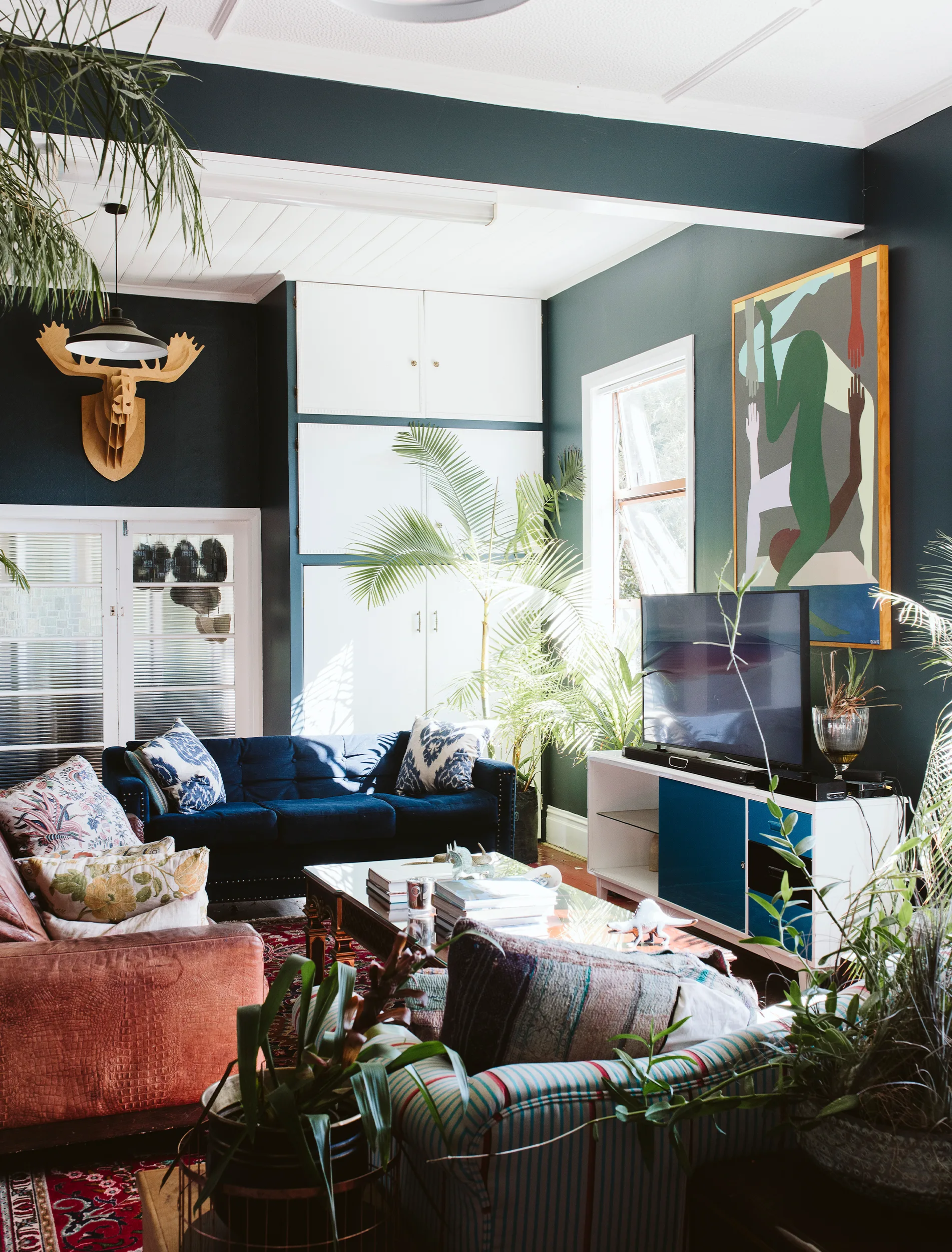 Michael insists the villa is unrenovated, but you’d be hard pressed to describe it that way if you’d seen the lounge and dining areas. Rich blue and pale walls are perfect backdrops for his art and, as you’d expect, plants. “When you’ve got a lot of white trim, you can’t lose,” he says of the blue paint, Resene Coast. The picture of the white dog is by Reuben Paterson, the wall hanging in the dining room is by Kay George, the bright ceramic piece is by Christine McLean and the wooden stag’s head was a Father’s Day present. The tall African milk tree behind the crocodile leather couch was left when Michael took possession of the property. “They’re as tough as old boots,” he says.