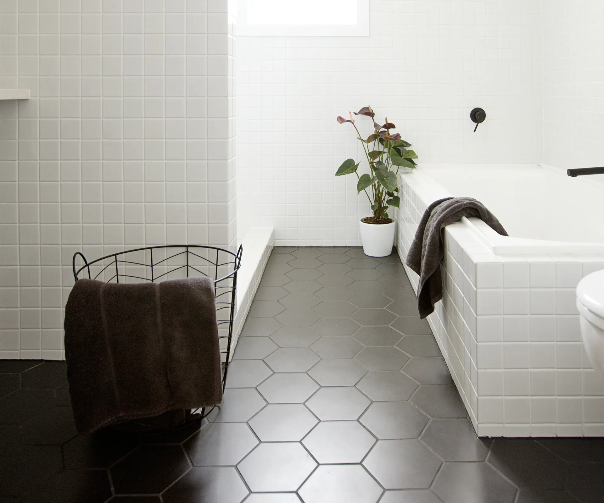 We designed the layout ourselves by drawing up a few different scenarios for the shower, vanity, toilet and bath, and then deciding what we thought would work, and look, best. We altered the old layout significantly so a big chunk of our bathroom budget was spent on plumbing. We wanted to make the room appear bigger as it isn’t a huge space, so we went with white floor-to-ceiling tiles on the walls, and black hex tiles on the floor. Black and white never go out of style, which was why we chose to stick to that colour scheme. Hopefully it will still look beautiful in years to come.