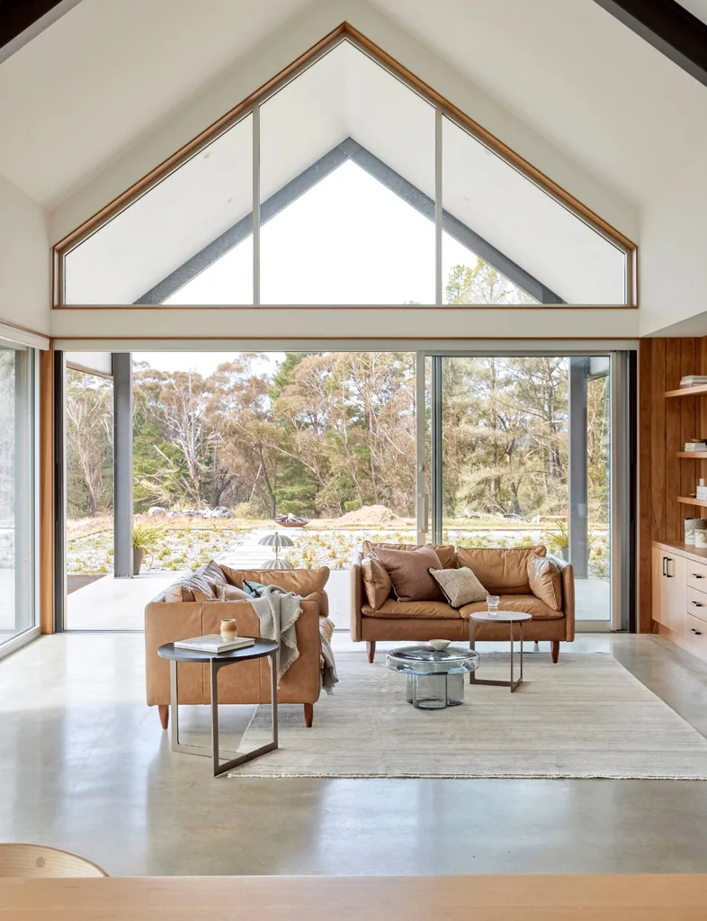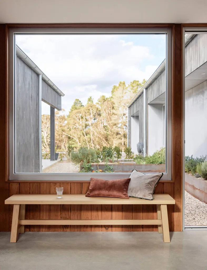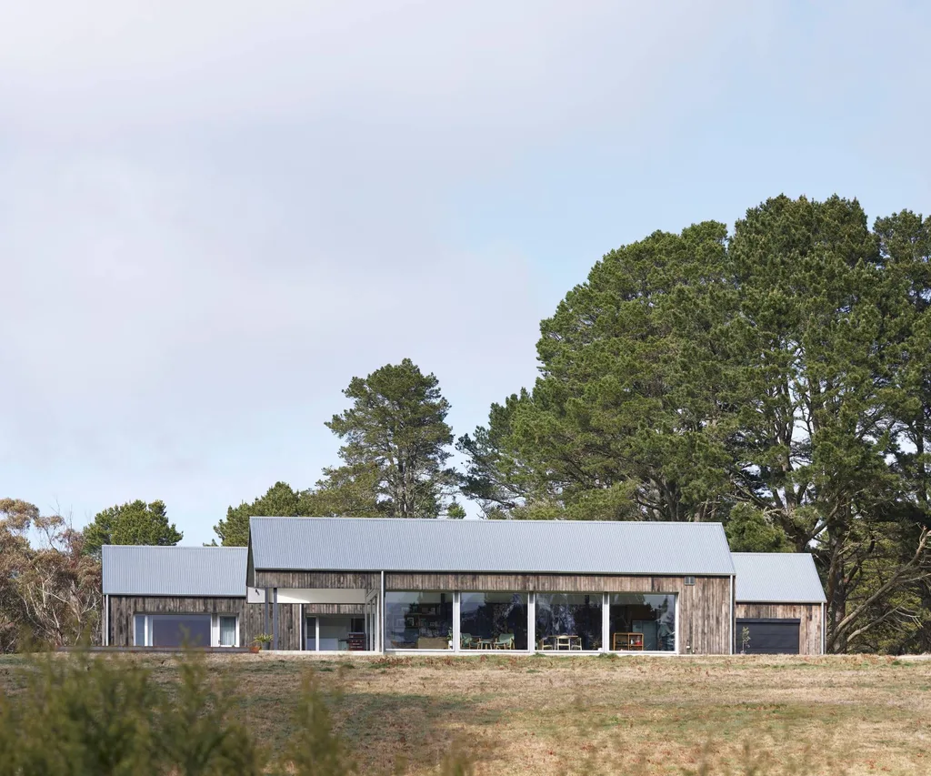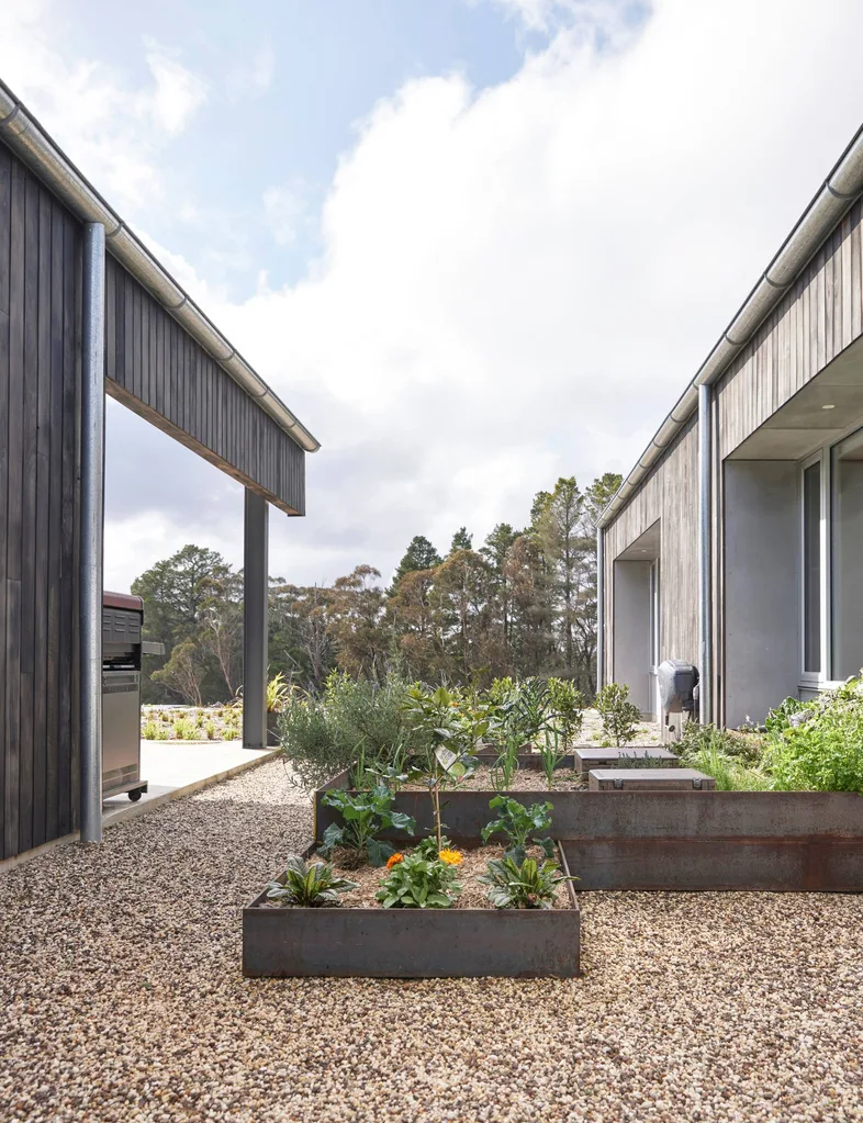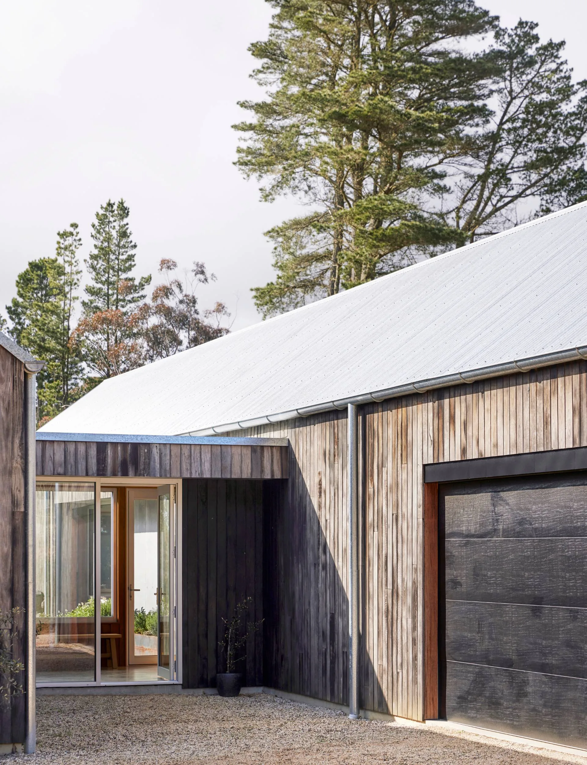 Externally, the house has a simple, barn-like form. This design was inspired by a nearby apple packing shed, a throwback to when the land was an orchard. The house shares the same roof pitch as the shed. It features striking Japanese shou sugi ban cladding, which has been charred to create a low-maintenance, weatherproof finish.