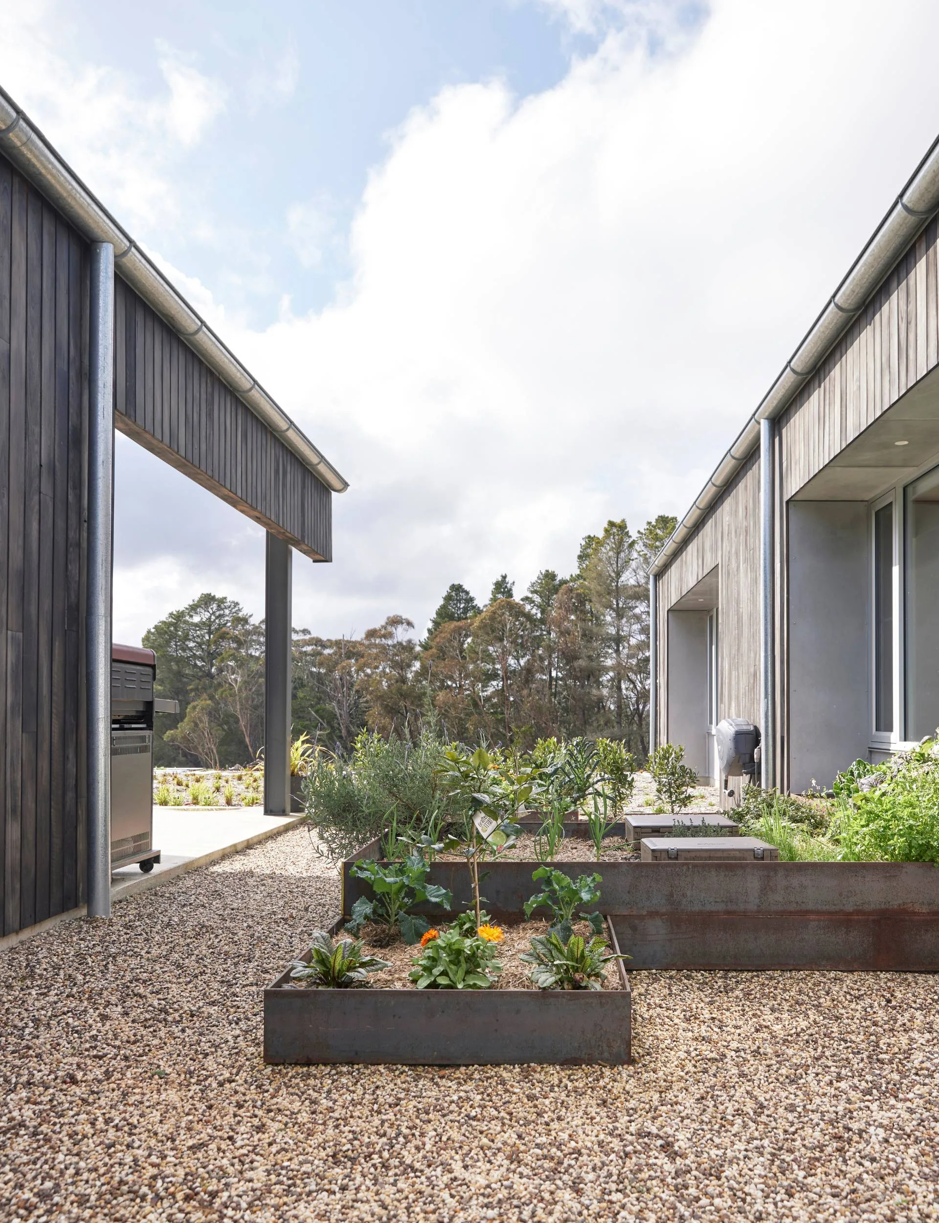 An east-facing courtyard is nestled between the house’s two wings. The courtyard is a lovely spot for a morning cuppa. It’s also a great sun trap for the couple’s series of raised kitchen garden beds.