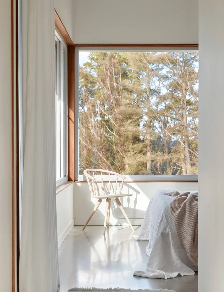 Polished concrete floors were chosen for their durability and thermal qualities, paired with accents of timber, stone and copper to warm the spaces. Everything is deliberately minimalist and understated so as not to detract from the stunning views through the oversized windows.