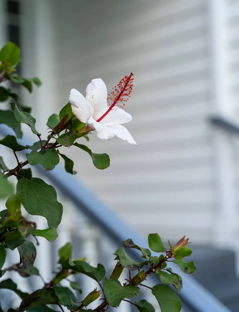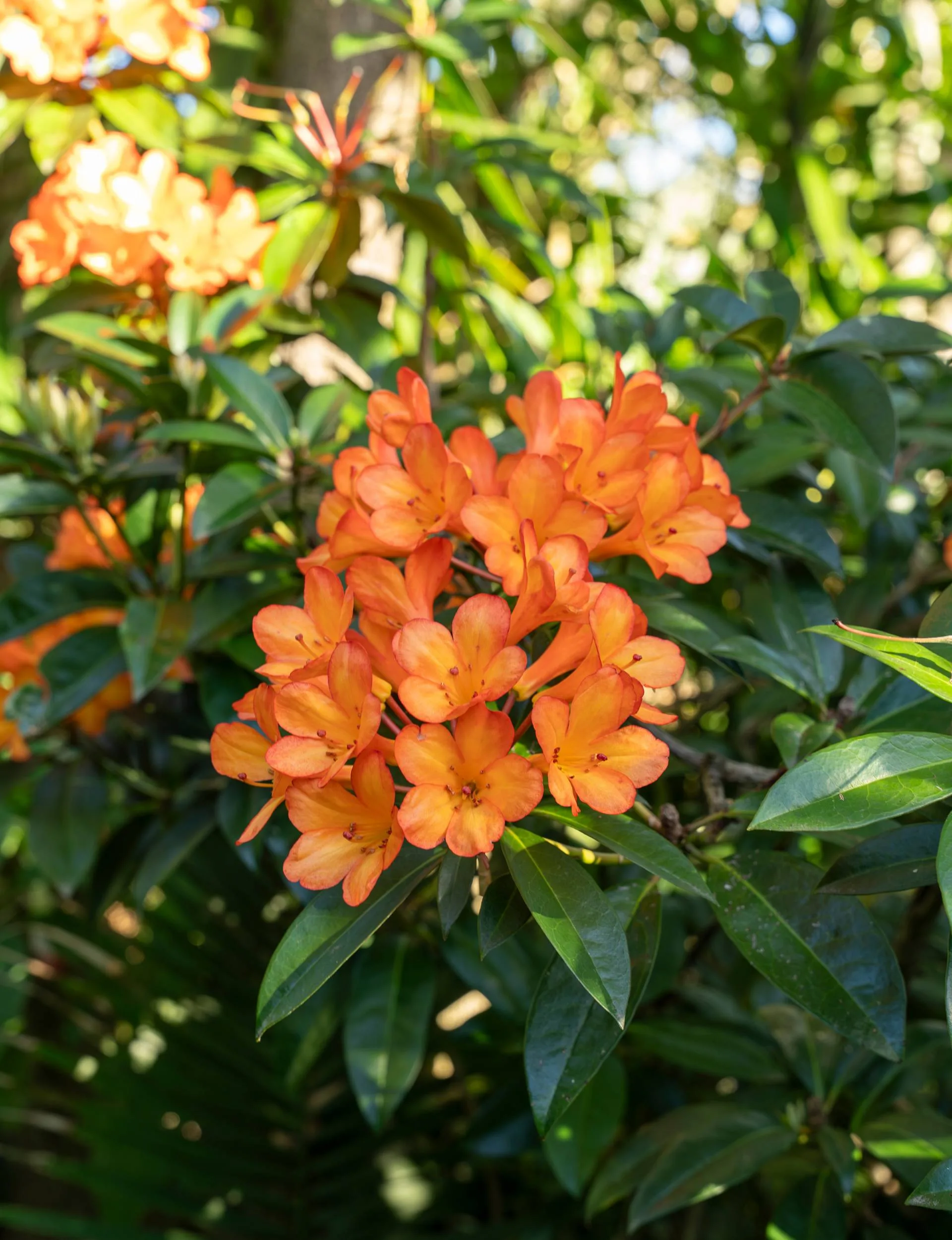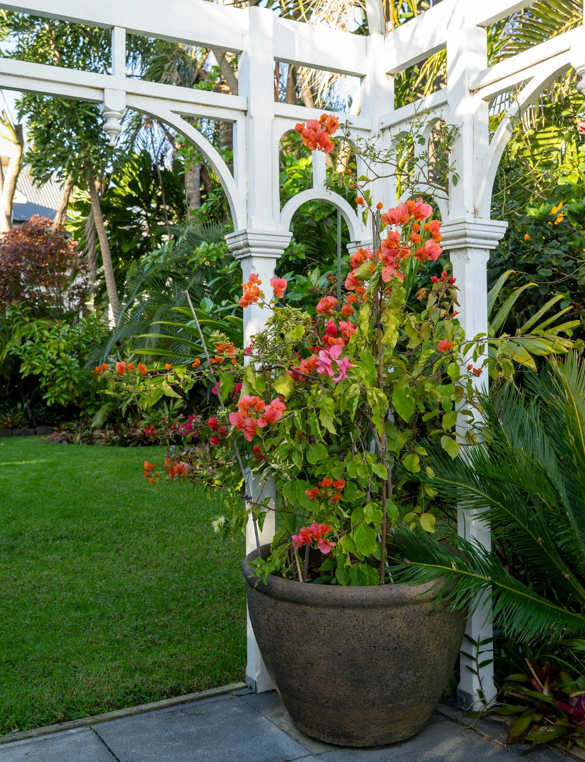 Brugmansias (angel’s trumpet), with their intoxicating scent, dangle their upturned trumpet-shaped blooms, in shades of peach, pink, gold and cream, just out of reach, while brightly coloured hibiscus bloom at waist height. Lower down, hebes, clivias in orange, red and yellow, and bromeliads fill the understorey, adding vibrant colour at ground level, says Mo.