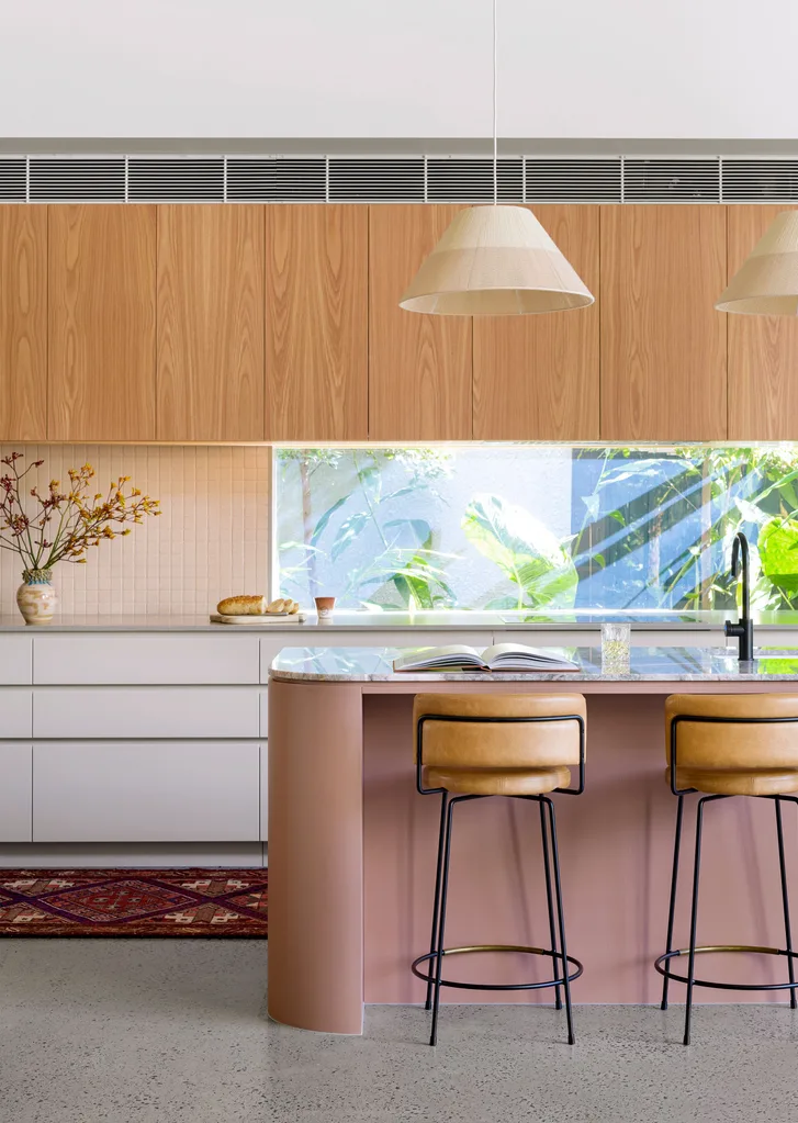 Carlene, who was a contestant on 2014’s The Block: Glasshouse along with husband Michael, says the home offers a colour journey that unfolds as you make your way through. “I always take my [colour] cues from the quality of light in a space and other items, such as the timber veneer, which had been specified by the architect,” she says. “The main living area is actually a low light space, so I wanted to use colours like the pinks, ochres and browns to create warmth as well as complement the timber.”