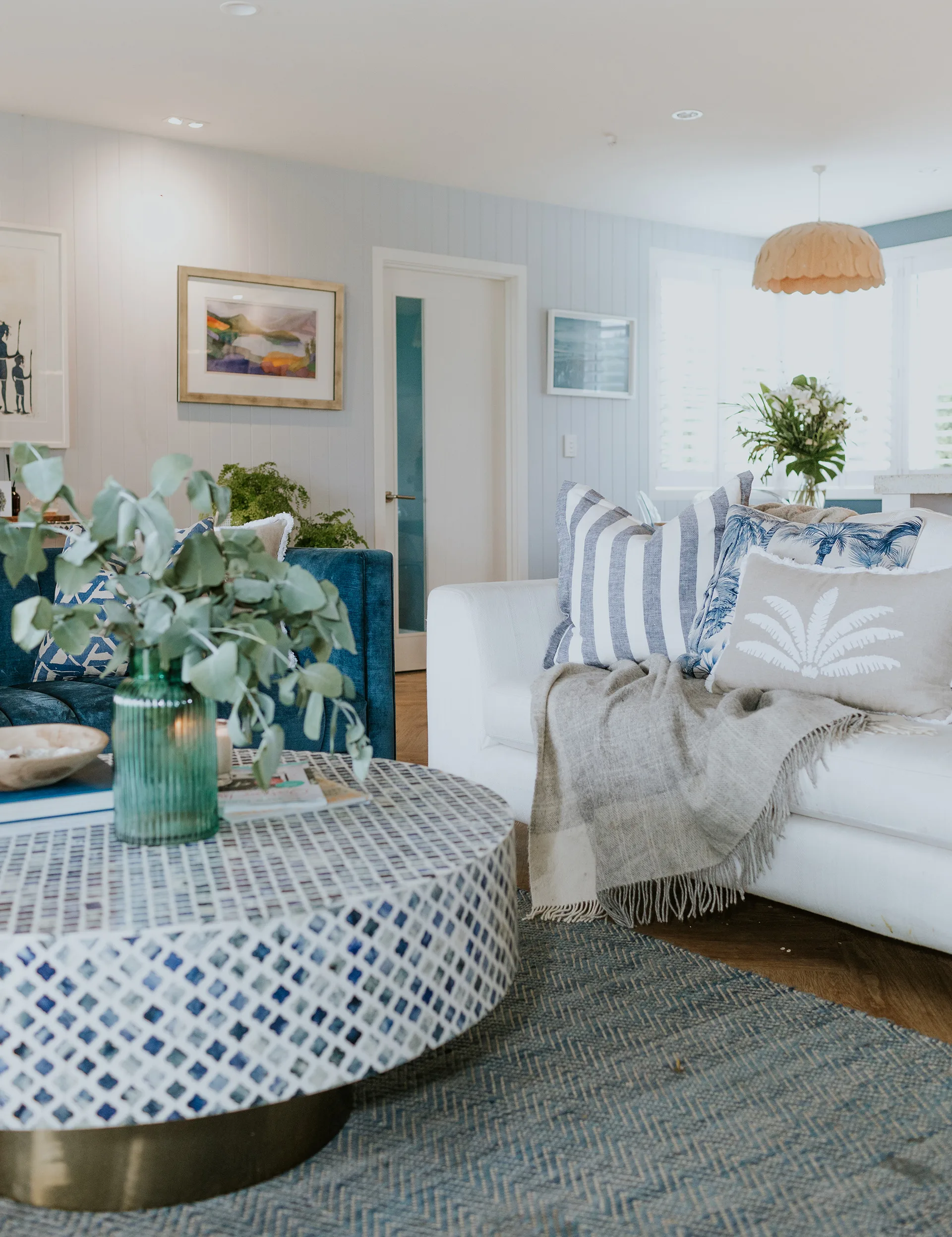 Annabel brought in more of that blue-and-white Mediterranean-inspired palette through custom-made outdoor squabs and plastered walls. “Plastering the fireplace wall and painting it Periglacial Blue was one of the best things we did, as it delivered the vision perfectly,” she says.