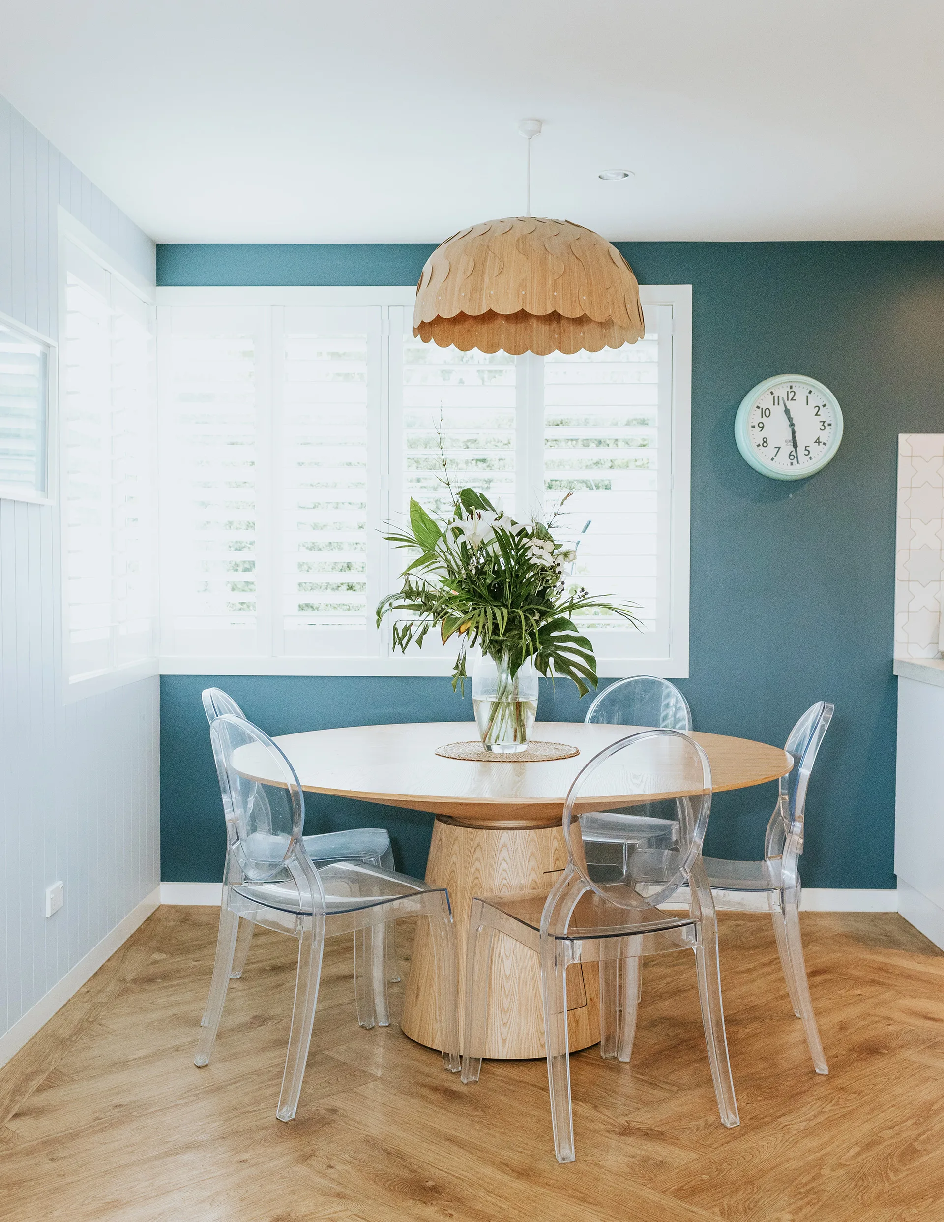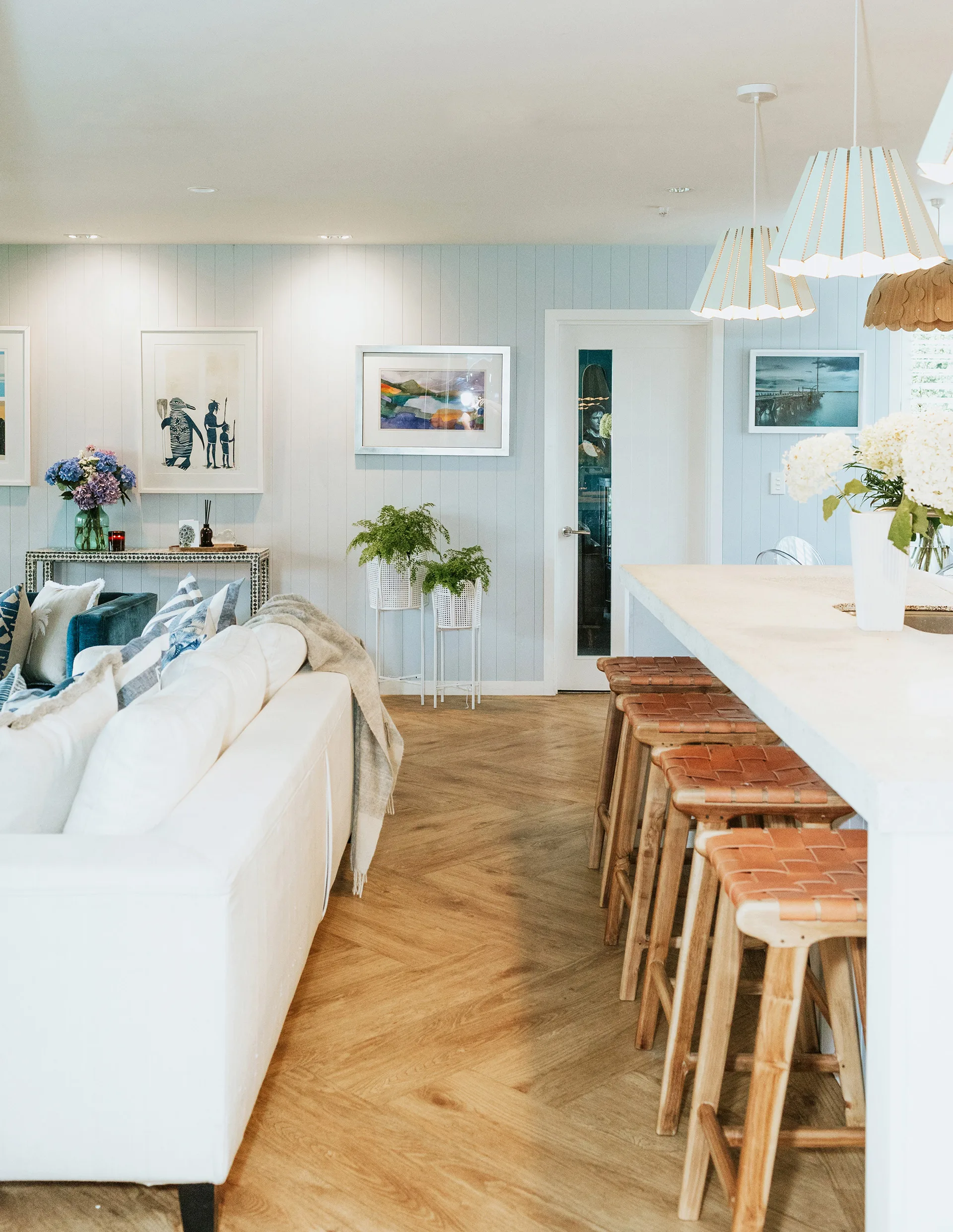 Using tongue-and-groove wall panelling throughout the home added texture, interest and an instant coastal aesthetic. Annabel introduced the panelling in the lounge, their kitchen island and both pool-side rooms, using it all the way up to the ceiling. White window shutters were next, Annabel’s tried-and-true go-to for achieving a sophisticated Hamptons-style look.