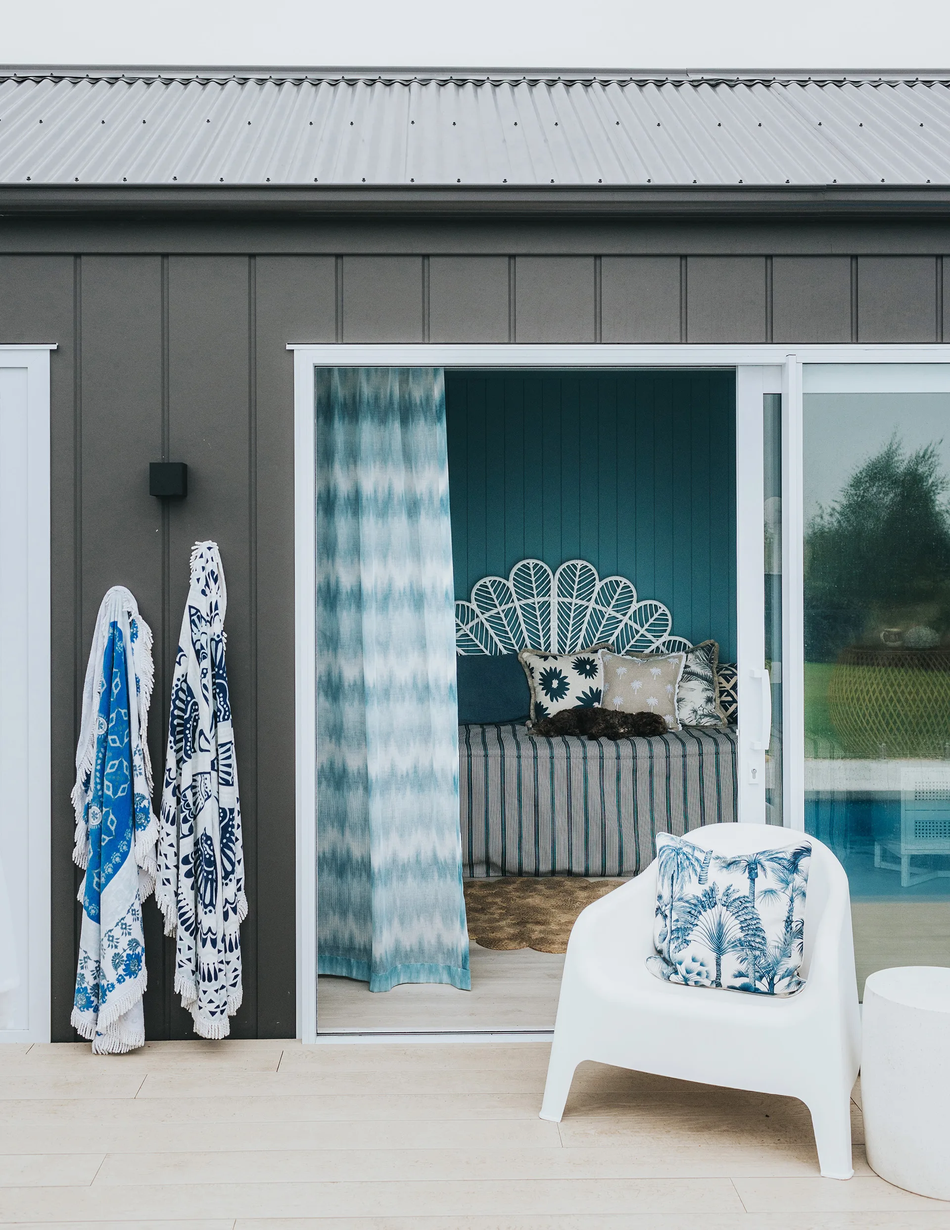 To fit with Annabel’s design brief of “a holiday at home”, she knew she wanted the pool house to be blue and white. “I chose a very pool-inspired colour on the walls to create that cohesion with the outdoors, and used stunning blue and white sheer drapery to create the mood we were looking for.”