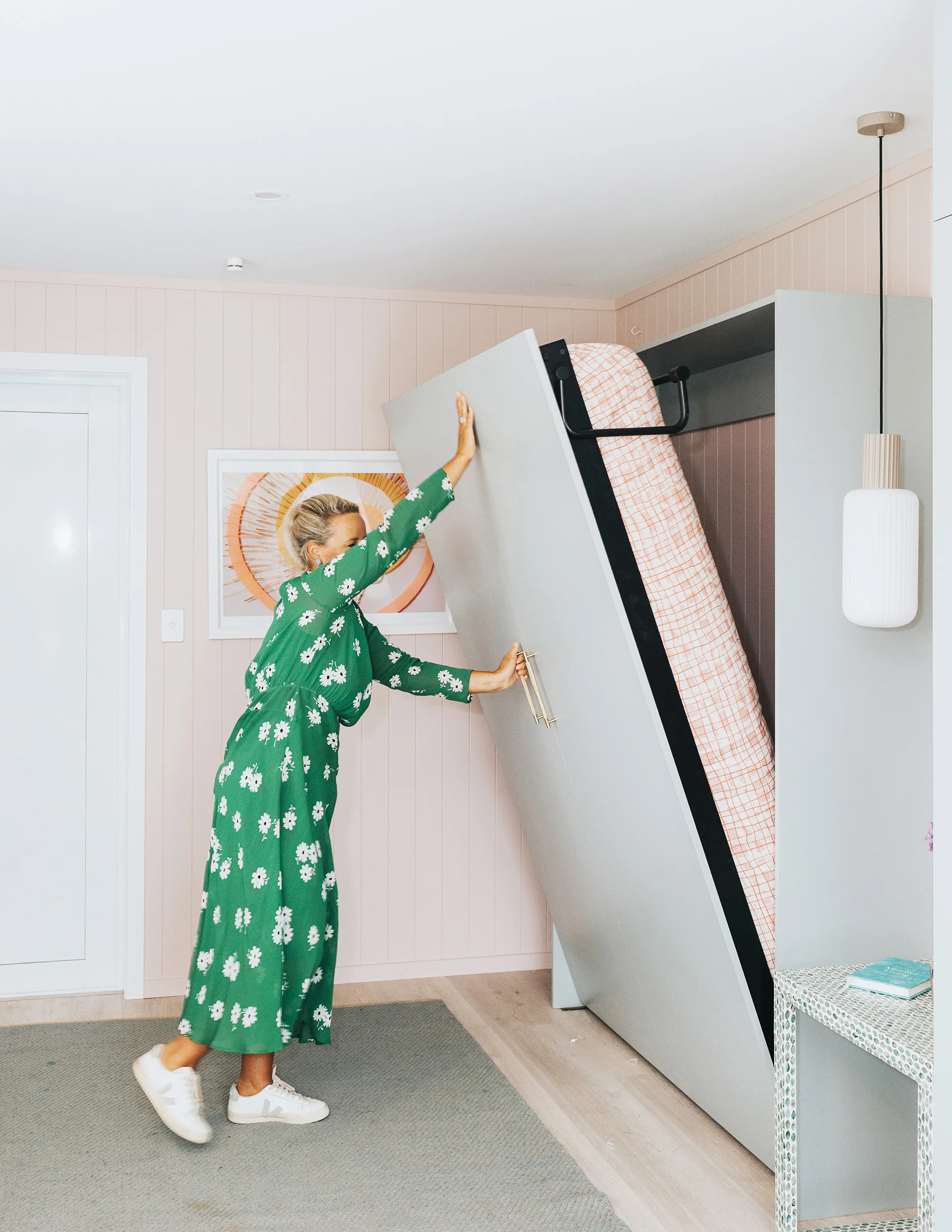 “I painted it in a biscuity pink to deliver a place of calm and warmth. Because it’s solely my space, I could happily make it feminine and ‘me’. I love this studio – it’s a space that I can retreat to and keep on top of work while still engaging with my children – but it’s also a beautiful space for guests to stay.”