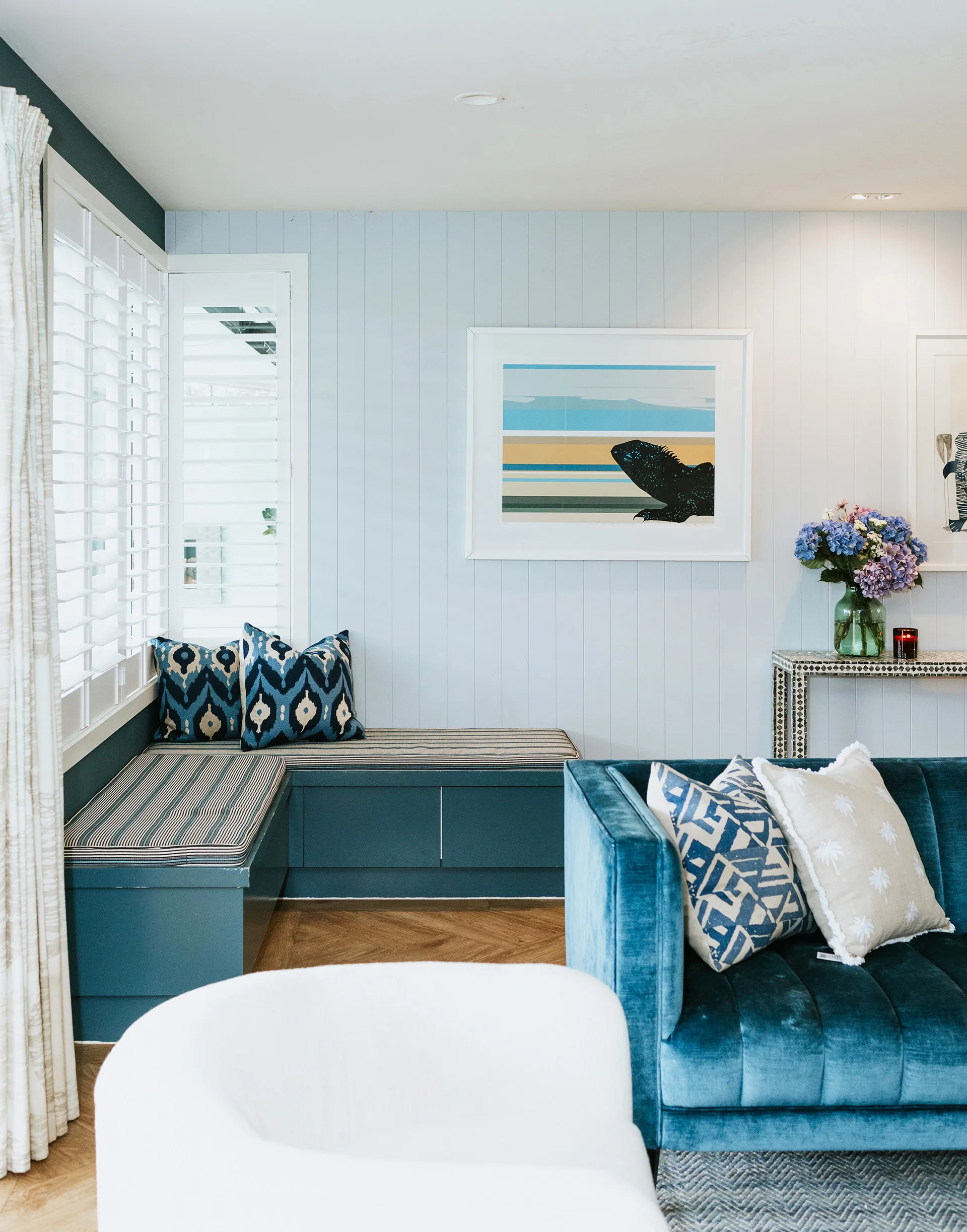 “We specify shutters for many of our clients because they are so beautiful and bring a sense of calm to a space. By installing lovely white timber shutters on our windows we instantly created that holiday vibe,” she says.