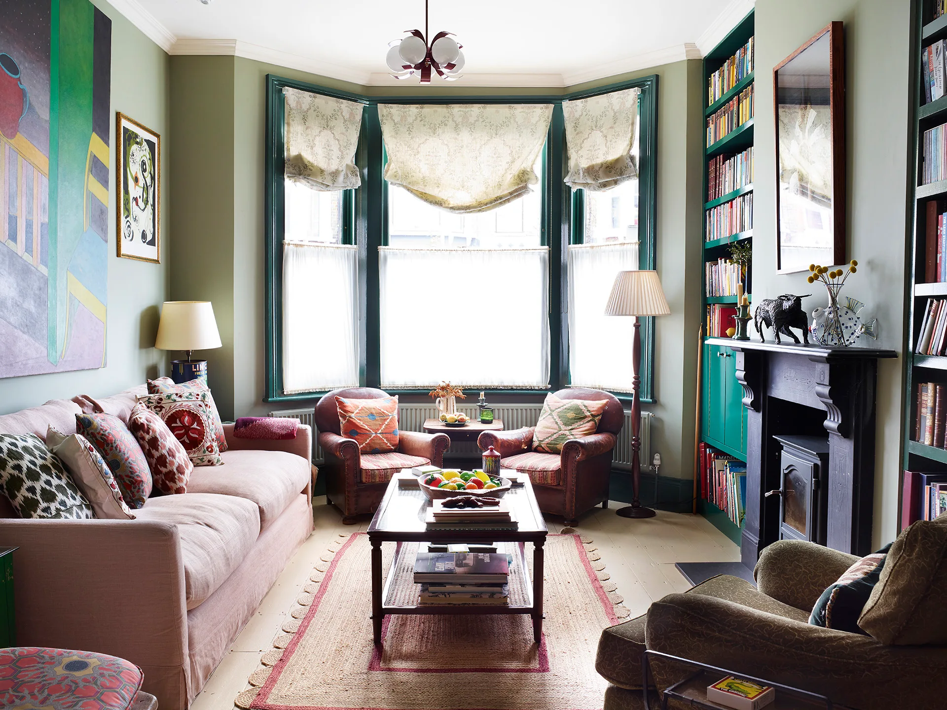 The paint shade that injects sunshine into their kitchen year-round is Orangery by Farrow & Ball, with candy-striped linen blinds and units that add a colour kick. In the living room, a more serene green – Farrow & Ball Lichen – sets the tone, while woodwork, door frames and shelving have been given a glossy paint finish to pep them up. “Adding that glossiness brings the whole scheme to life,” says Sandra.