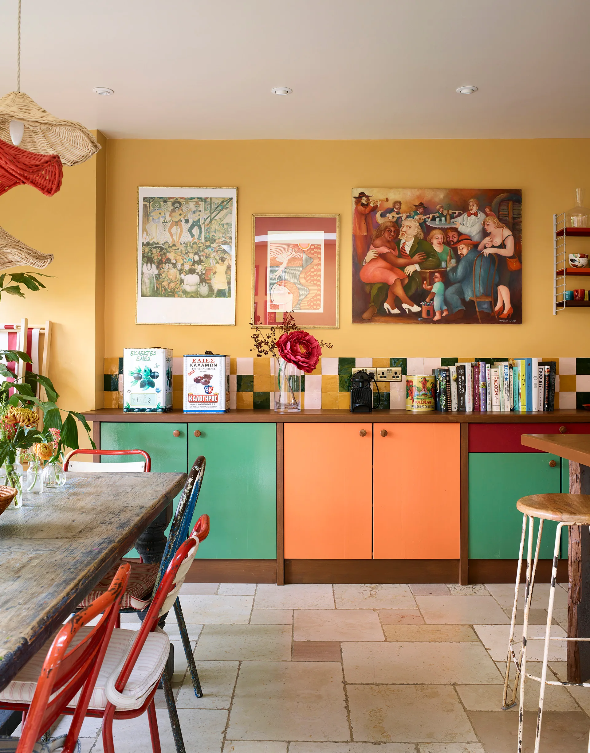Most recently, she got Felix redecorating their hallway, adding a warm band of yellow and a shelf with a scalloped trim that fits over the radiator. “I always find a way to add some extra decoration,” she smiles. More scallop shapes are dotted around the house, including the rattan lampshades by Matilda Goad, Sandra’s good friend. The fruit and vegetable theme also pops up regularly, with bowls of faux fruit and veggies, and giant vintage vegetable tins that Sandra uses as lamp bases. “The jury is still out on whether my jewellery influences our home style, or the other way around.”
