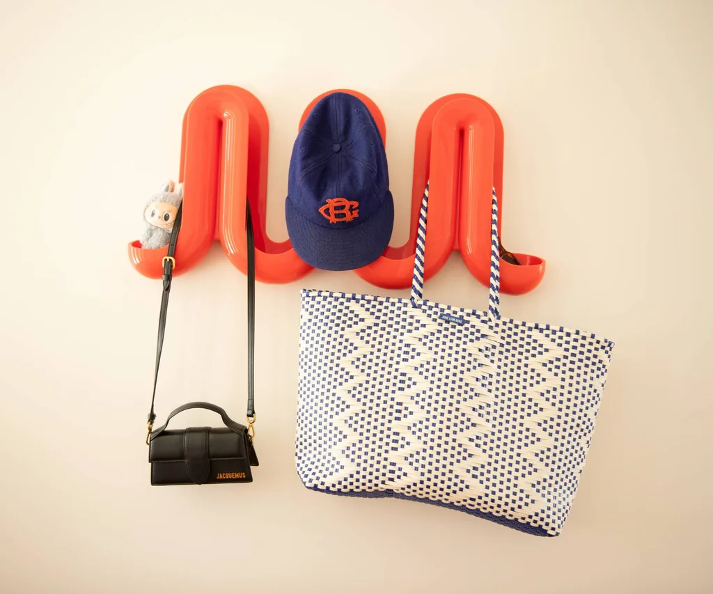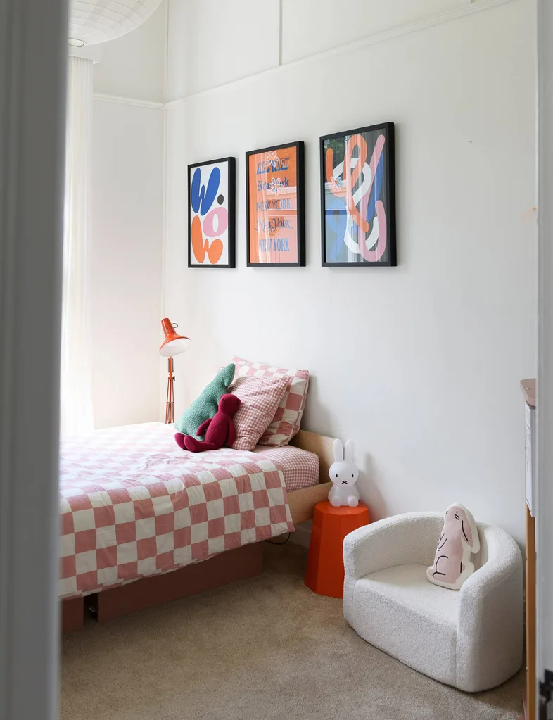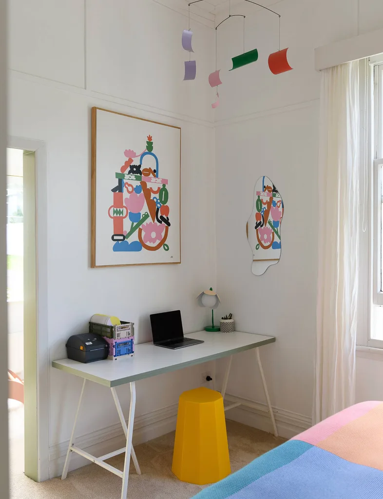 That playfulness carries through the rest of their home. White walls act as a backdrop for a collection of colourful, often irreverent pieces. A giant pencil hangs above the TV, and an oversized burger sits in Gwen’s room. They’ve scattered Arnold Circus stools throughout the space in various colours. “They’re ridiculously practical,” Sian says.