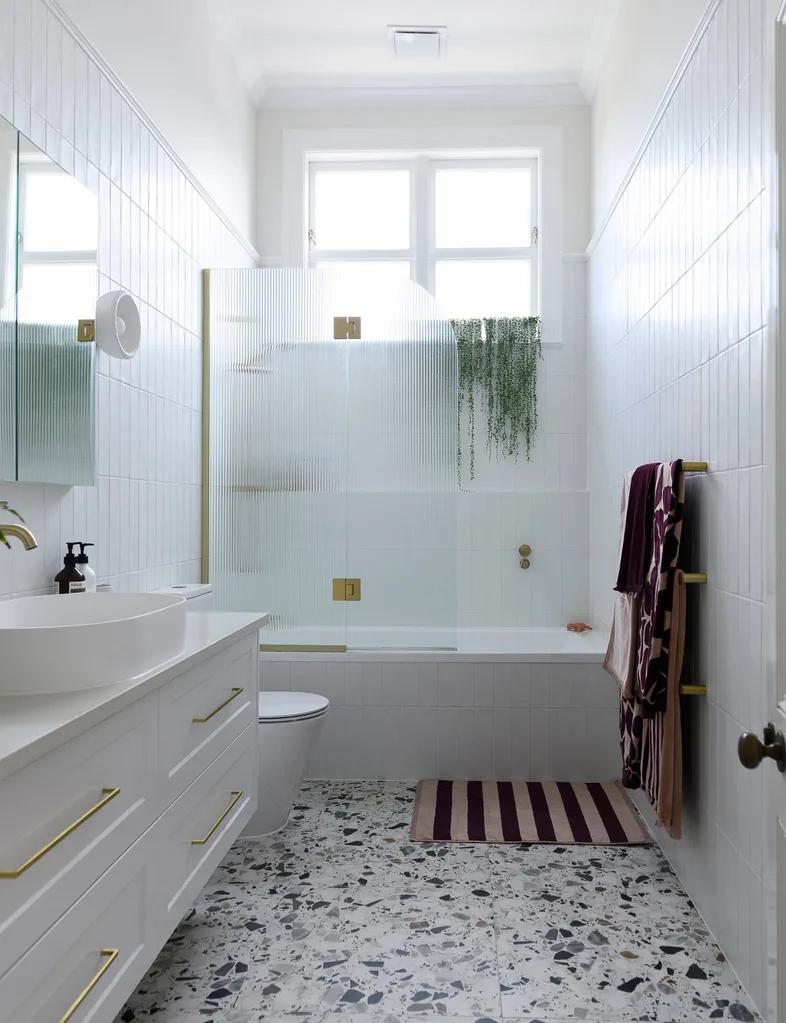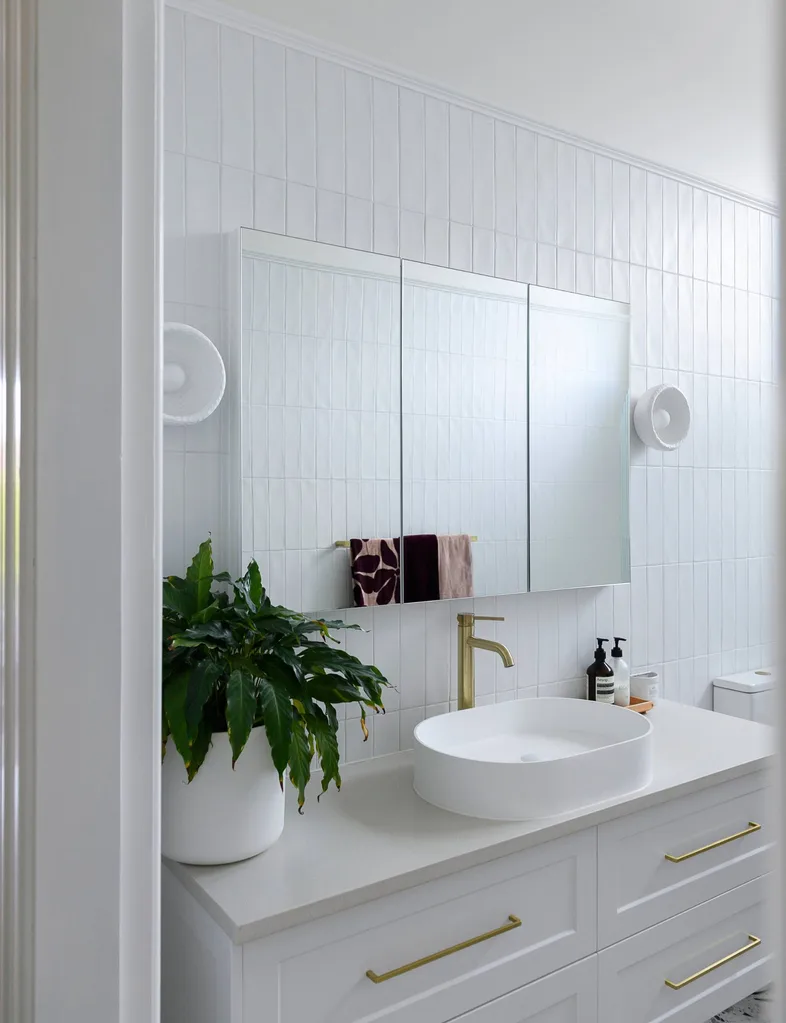 The pair were keen on having consistency throughout the house. You’ll notice the kitchen cabinets look the same as the primary wardrobe. The kitchen splashback tiles match the bathroom tiles, and the kitchen tapware is a match for the bathroom’s, too.