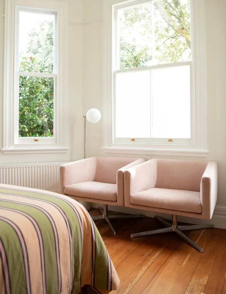 “We wanted the house to be a blank canvas. Hagan and I both really like ‘things’, and we didn’t want to compete with existing colour. Our personal style leans toward bright, mid-century design and more modern pieces – a nod to our millennial Hypebeast days. We kept the walls clean and simple, so we could add colour through artwork, furniture and decor.”