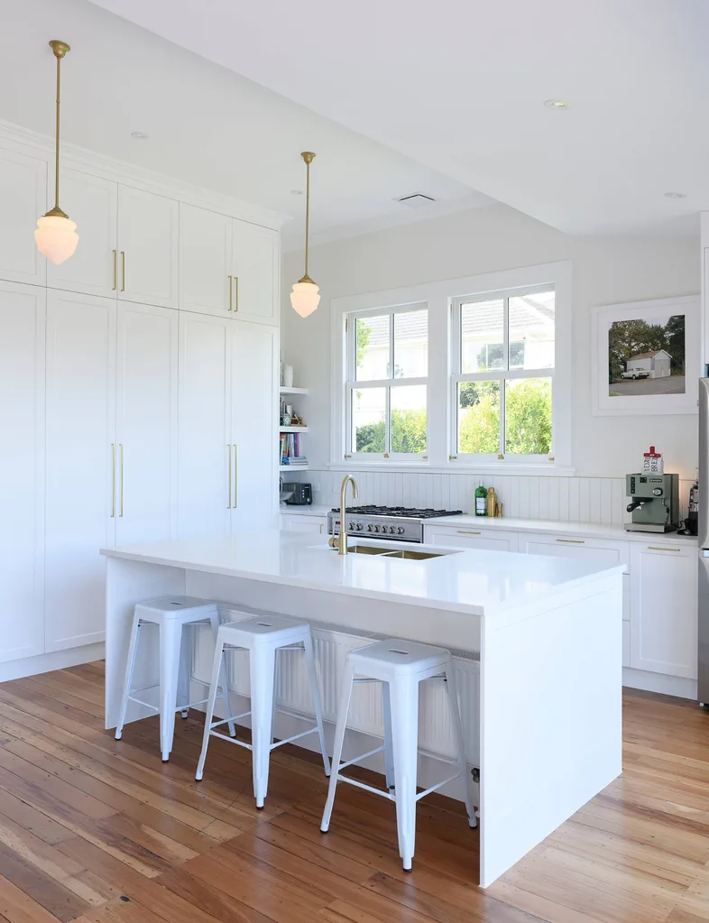 “We doubled the size of the kitchen in the renovation. Like it or not, the party always centres around the kitchen, so we designed it to ensure it flowed seamlessly from the living and dining area. Before the reno, the formal living room made entertaining a squeeze. Now, we have people over with any opportunity we get.”