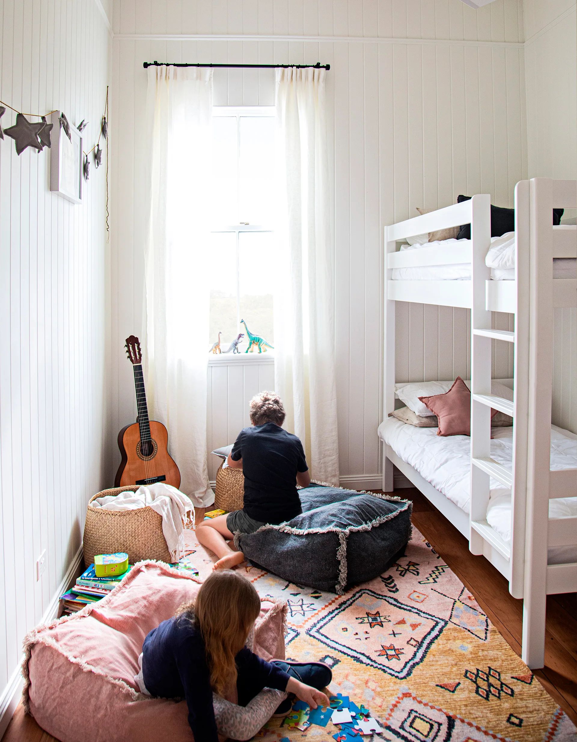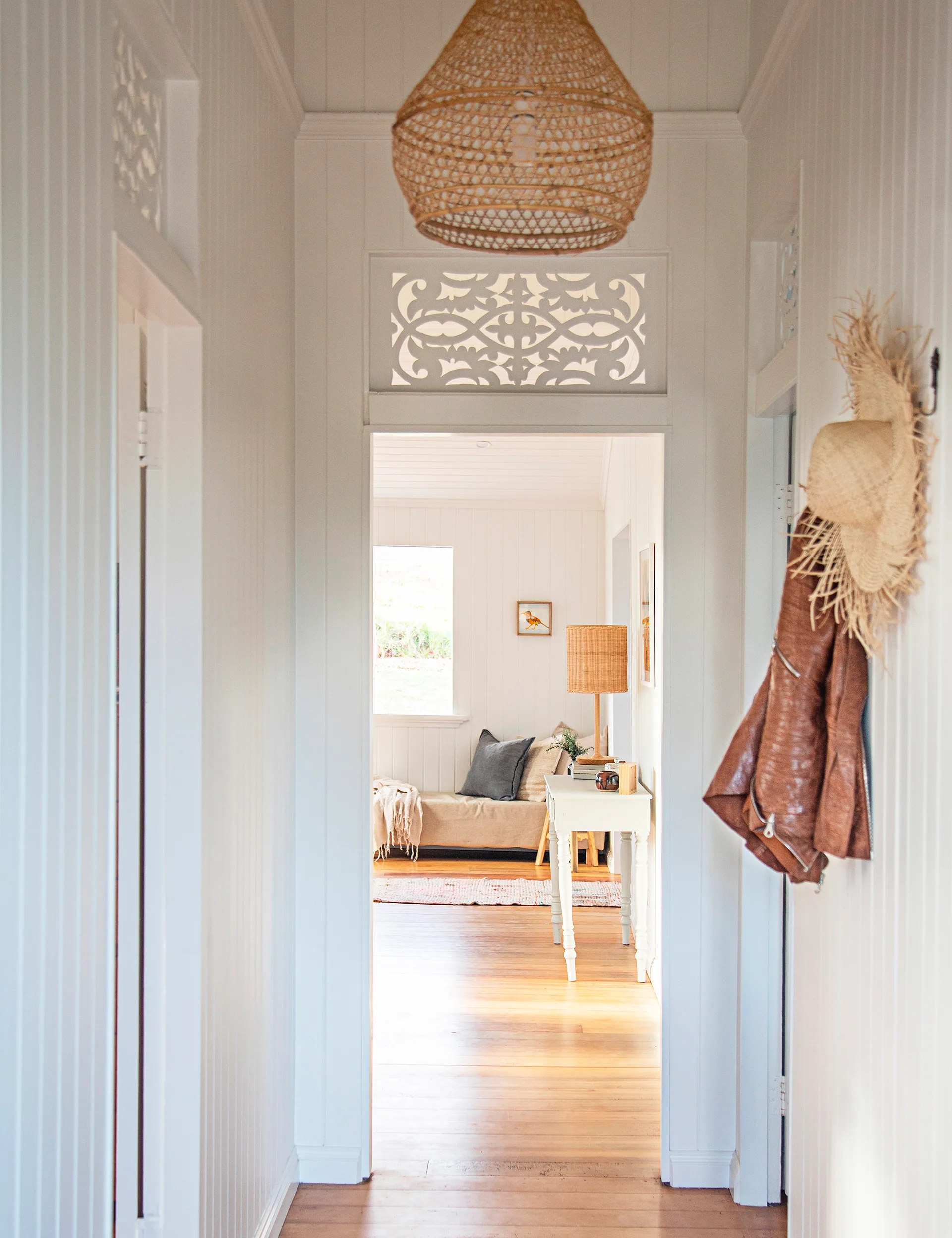 Julie says when they first inspected the three-bedroom house, her heart skipped a beat. “It was love at first sight,” she says. “It had tongue-and-groove panelling throughout, original hoop pine floorboards, original fretwork and ceiling roses… and the sweetest green casement windows.” It had been cut in half, its roof removed, and was ready to be relocated.