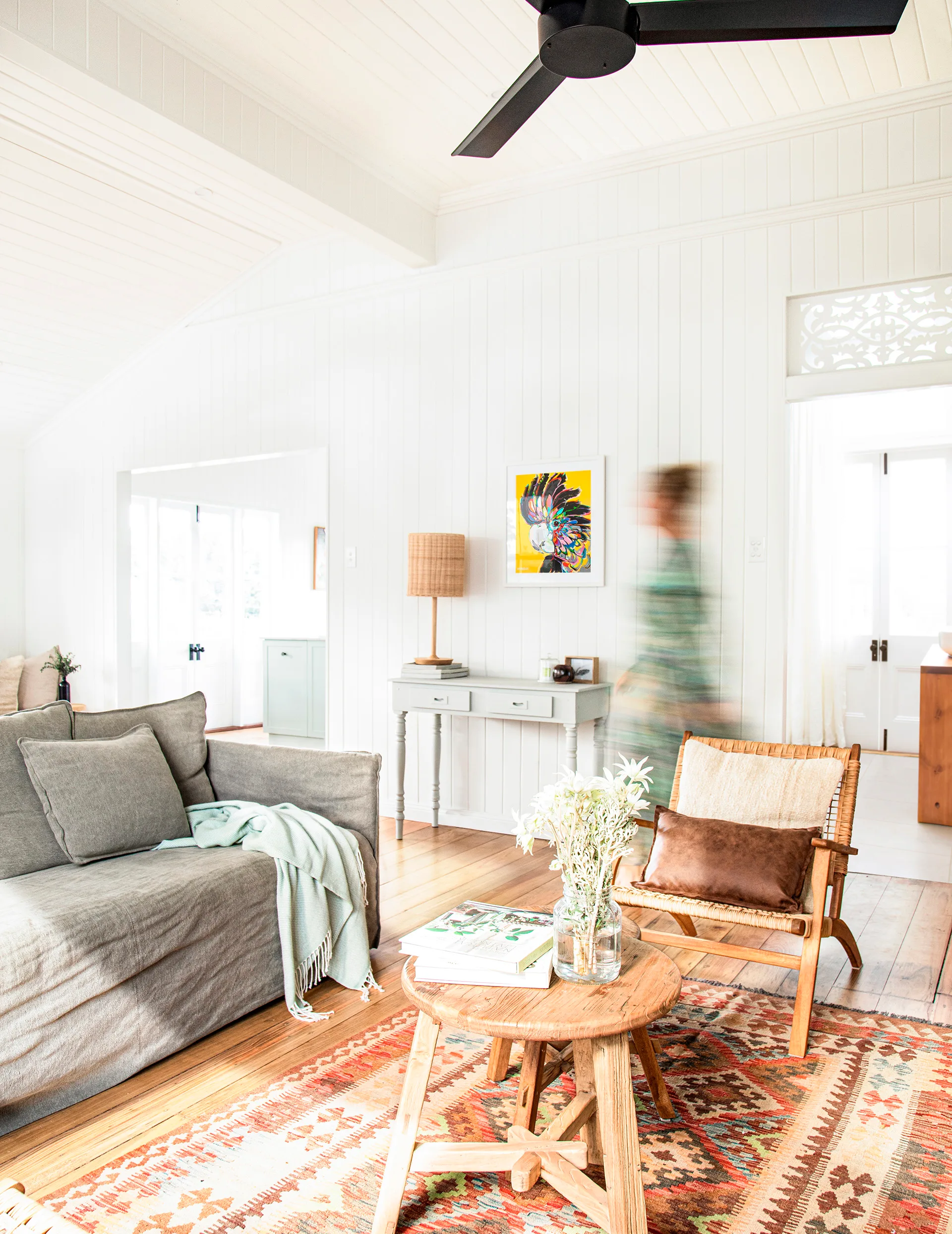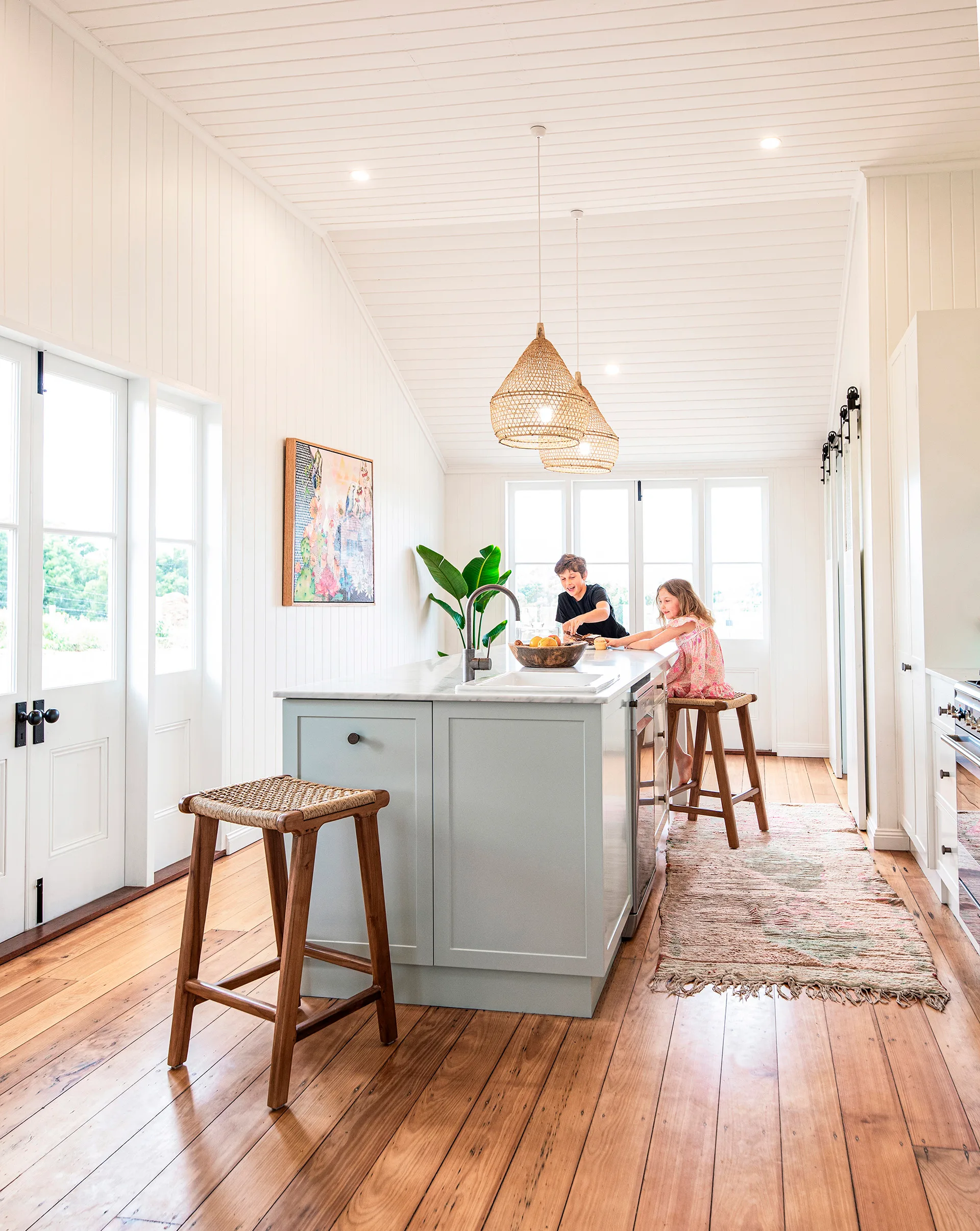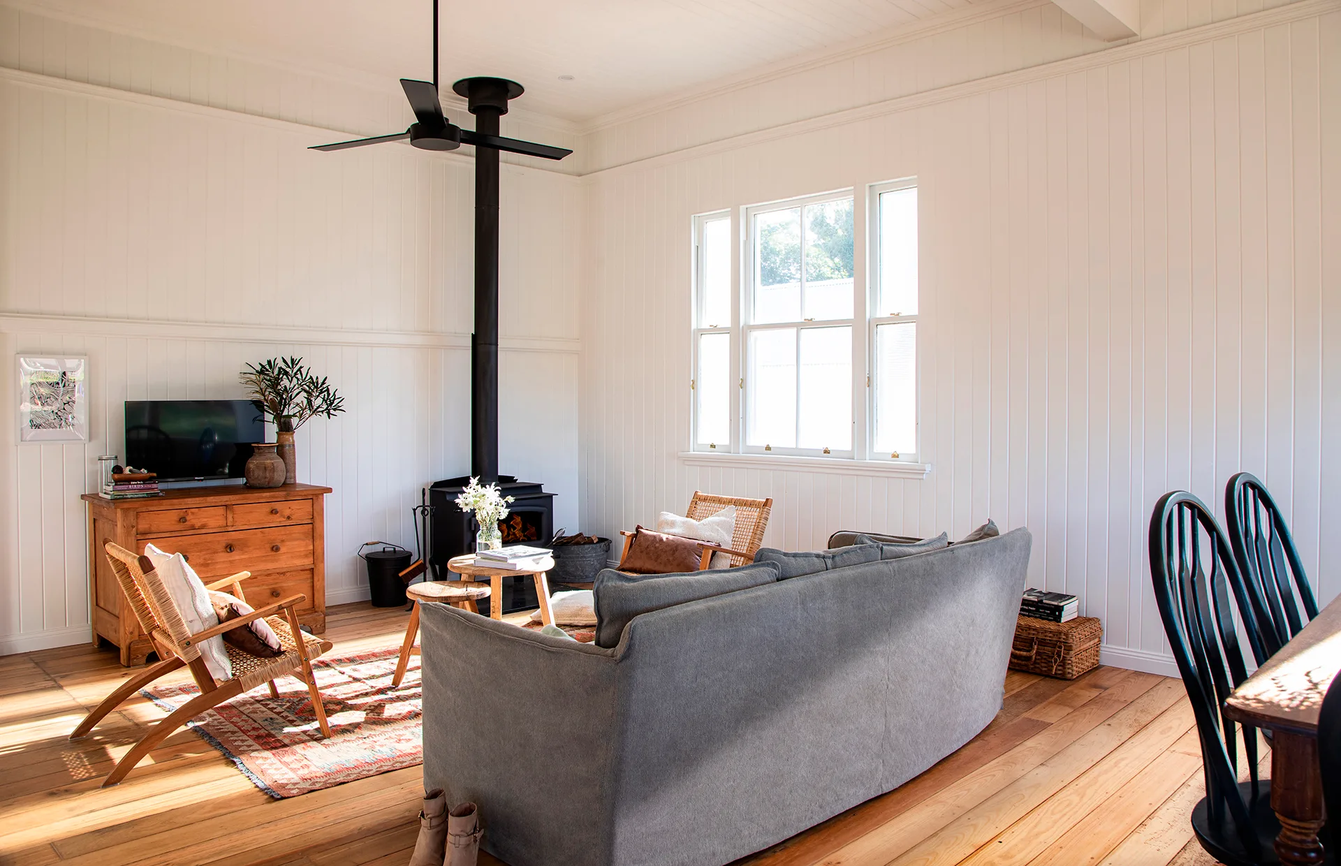 Once there, the home was repiled and stitched back together, which took about a week, and the roof replaced. The house also had to be connected to a septic system, rainwater tanks and power. “The house was in an unliveable condition, with no functioning bathroom and kitchen,” says Julie. “It was a major renovation.”