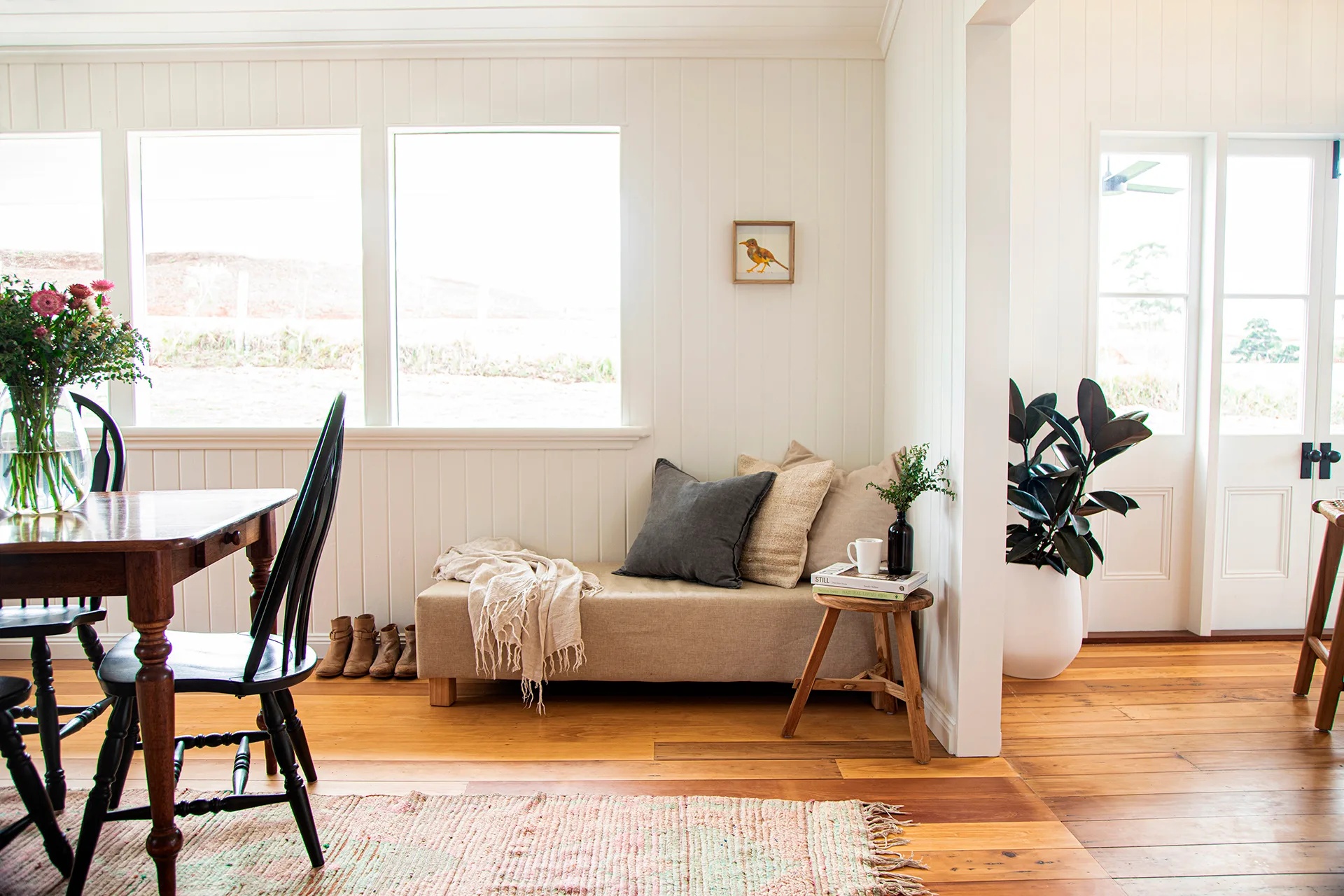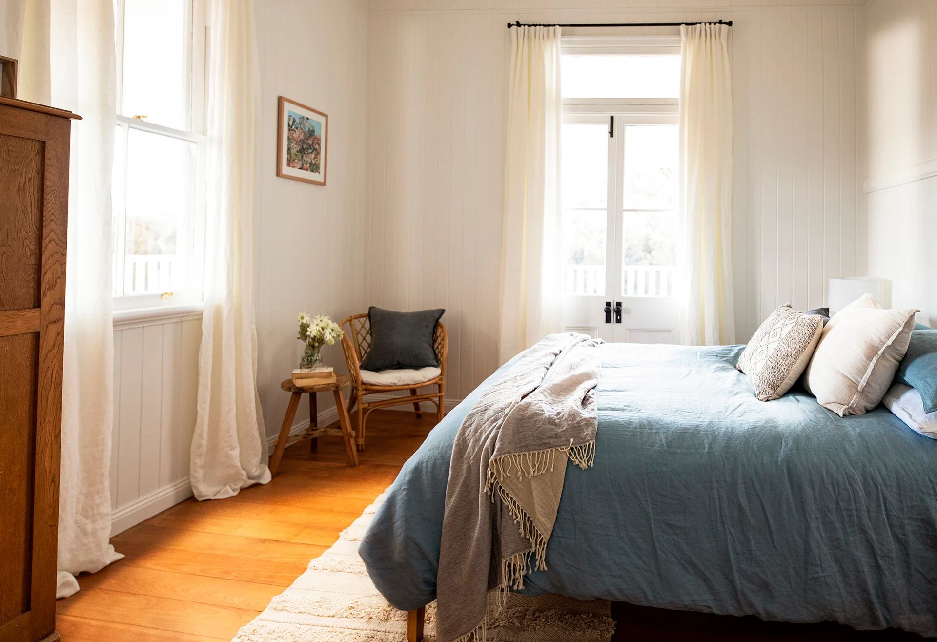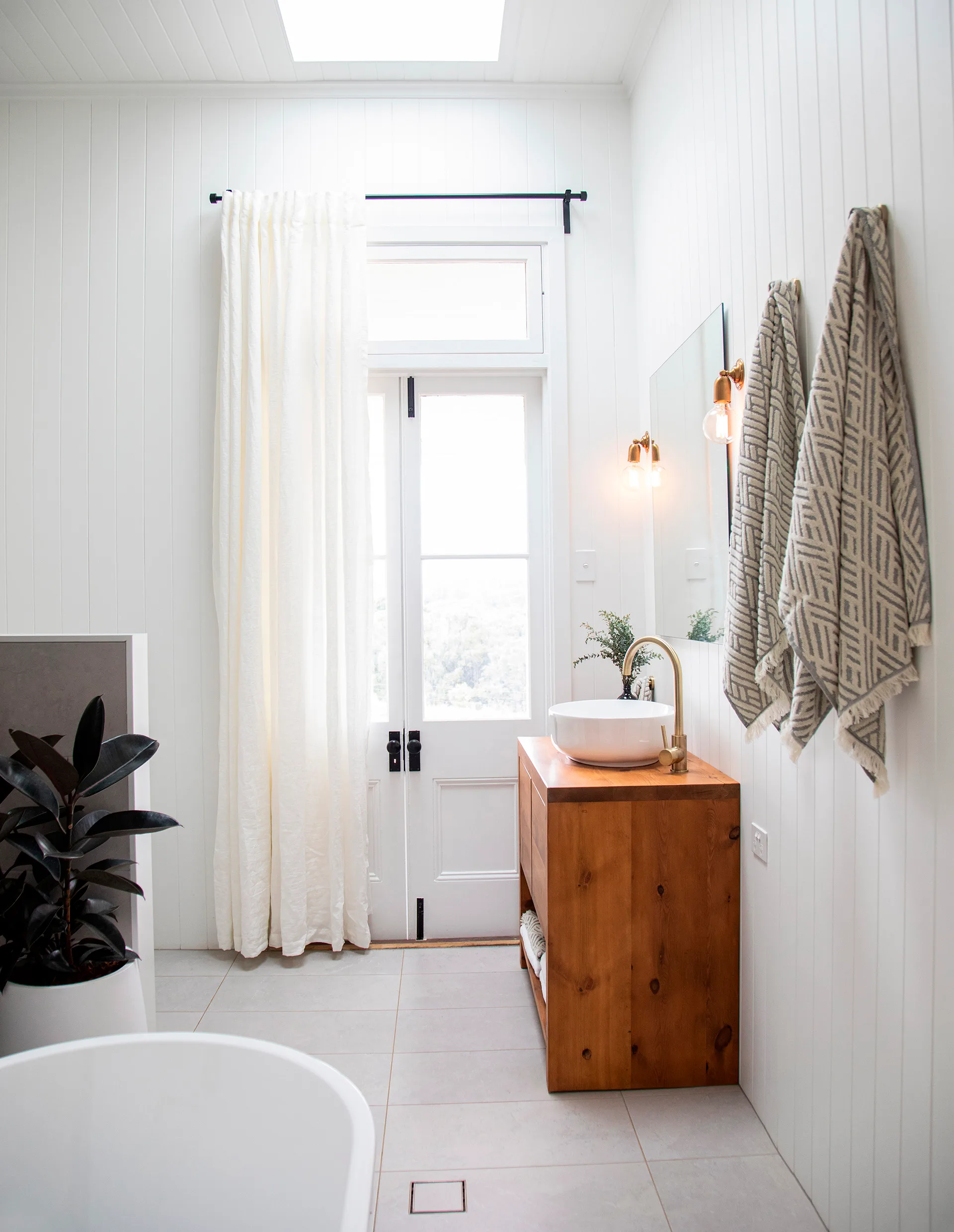 Once there, the home was repiled and stitched back together, which took about a week, and the roof replaced. The house also had to be connected to a septic system, rainwater tanks and power. “The house was in an unliveable condition, with no functioning bathroom and kitchen,” says Julie. “It was a major renovation.”
