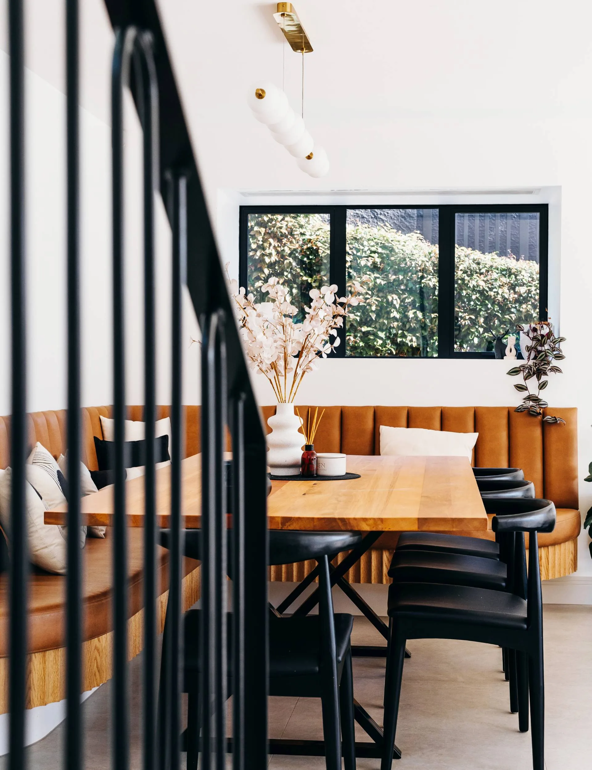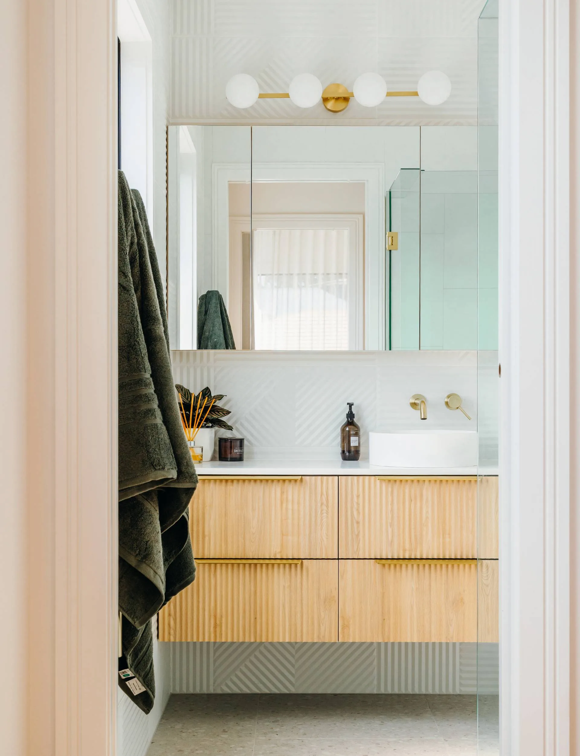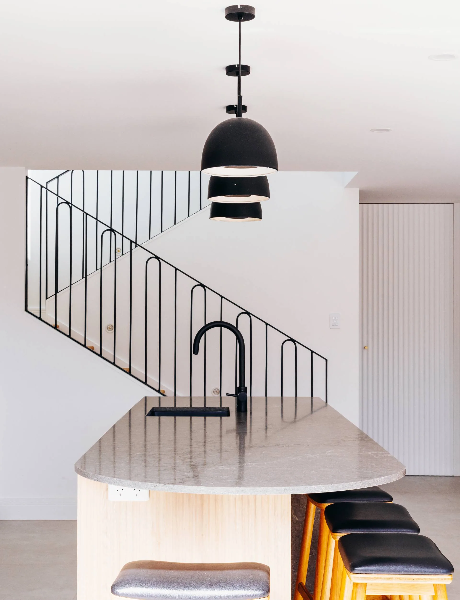 Here, a repeated motif – the distinctive profile of fluted panels – lines the island, a built-in bench seat in the dining area and the fireplace wall. These curves are a contemporary nod to the art deco origins of the home and bring interest and character to what is, effectively, a new-build.