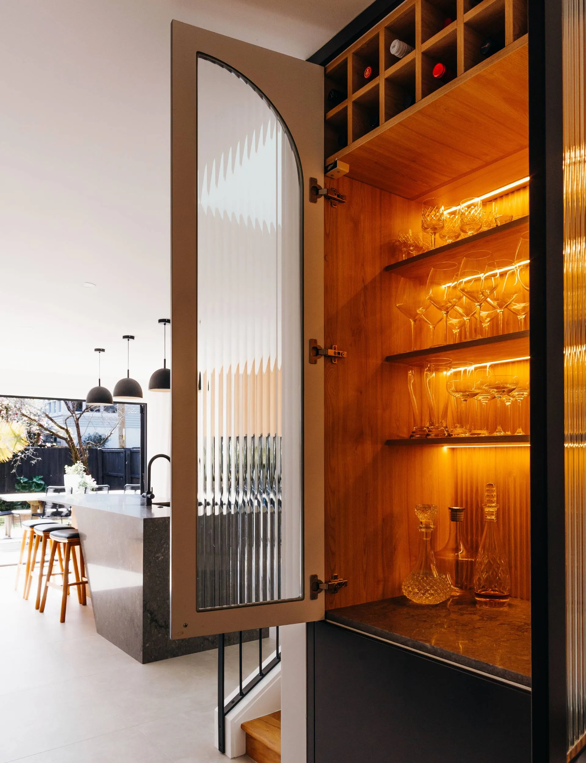 A custom-built bar with reeded glass fronts that reference the 1930s era is another design extra.