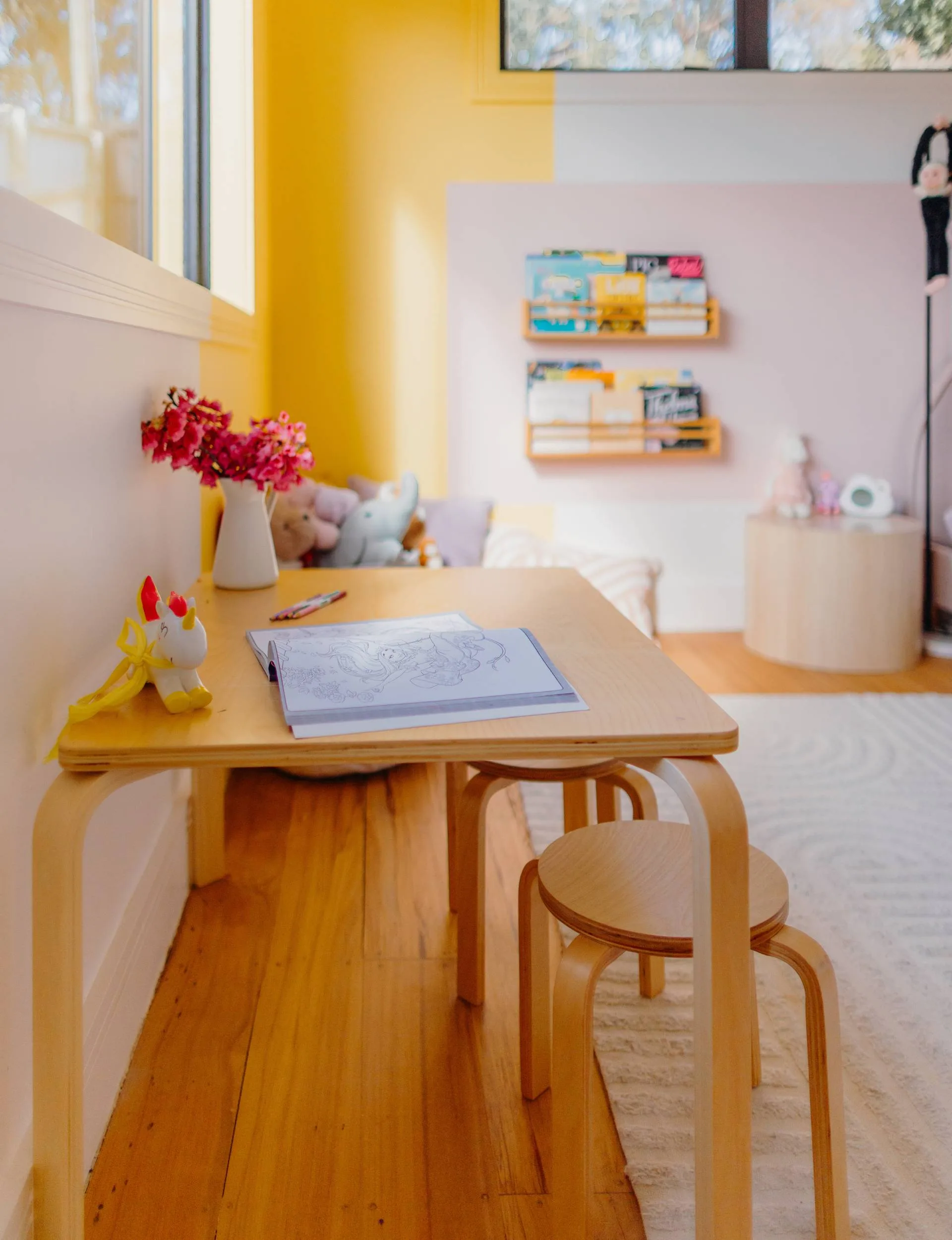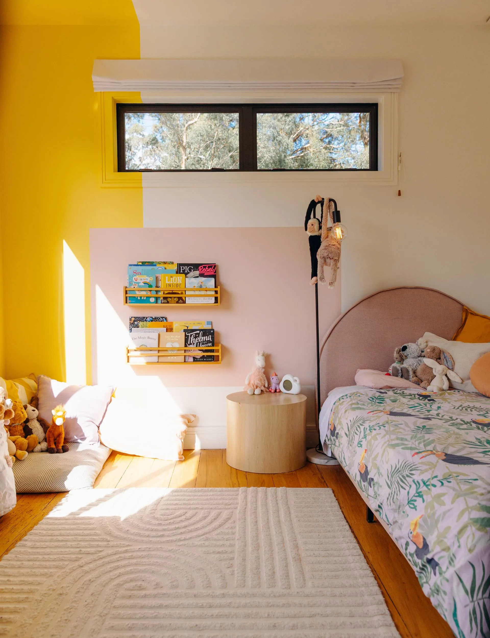 While what you don’t notice – storage in the attic, beneath the deck and in myriad built-in cupboards – is important, it’s what you do that makes the biggest impression. Upstairs, where the ceiling stud is an immense 3.4 metres, the children’s rooms are fun spaces. Amanda has used squares of yellow and pale pink to define a reading nook in one corner of Emilia’s bedroom.