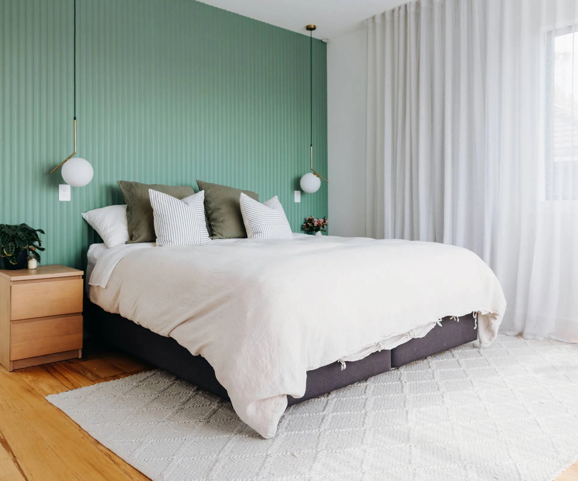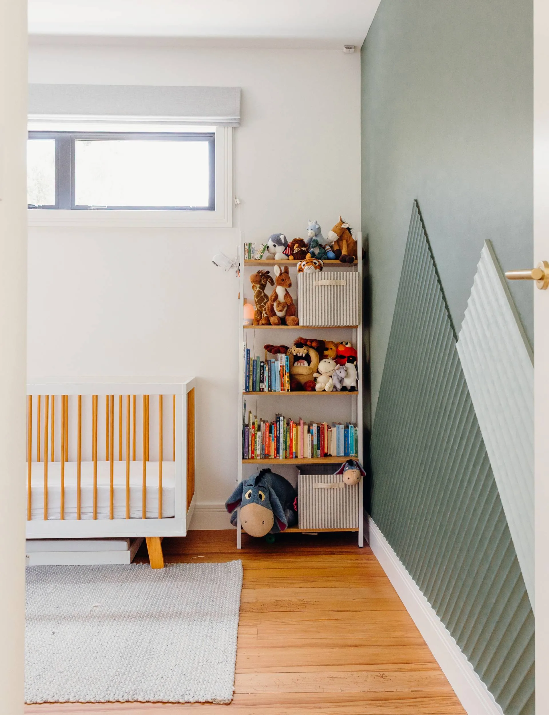 Hugh has offcuts of fluted panelling to craft ‘mountains’ on his wall, painted a lovely, serene green.