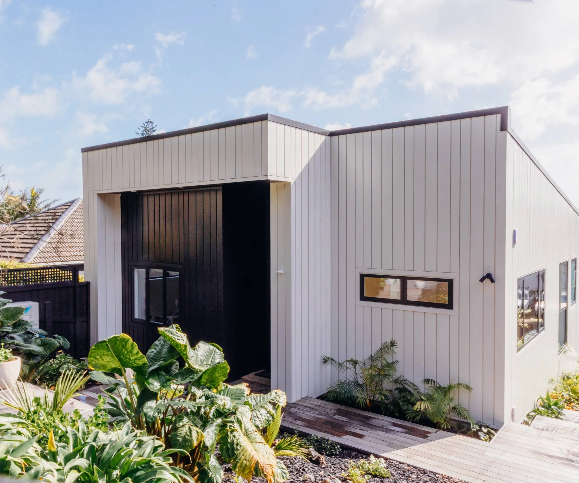 The garden, which opens directly from the kitchen and living area, was levelled and retained so that a flat lawn could be installed. Amanda’s mum contributed her easy-care plant knowledge while her dad assisted with some grunt work: “The blocks of grass for the ready-lawn were much heavier than expected,” says Amanda, “which we found out when we had to lug them all up and over the retaining wall.”