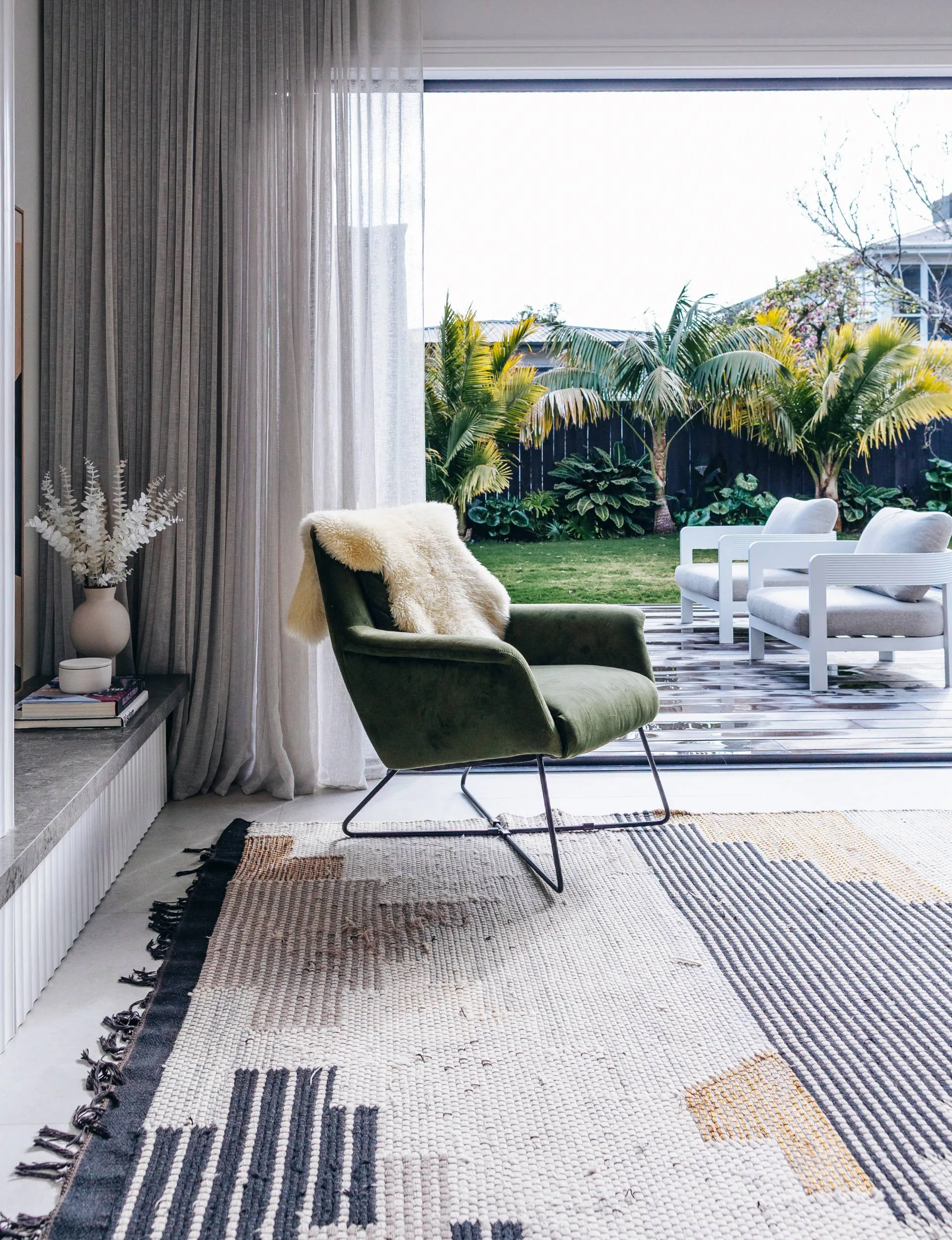 What she did do was tie the whole house together, with texture and colour. Downstairs, where a picture window and skylights now usher in swathes of light, the open-plan living zone features a step-down lounge furnished with tan and velvet green sofas. This is tied together with a rug and artwork that combines every aspect of the palette.