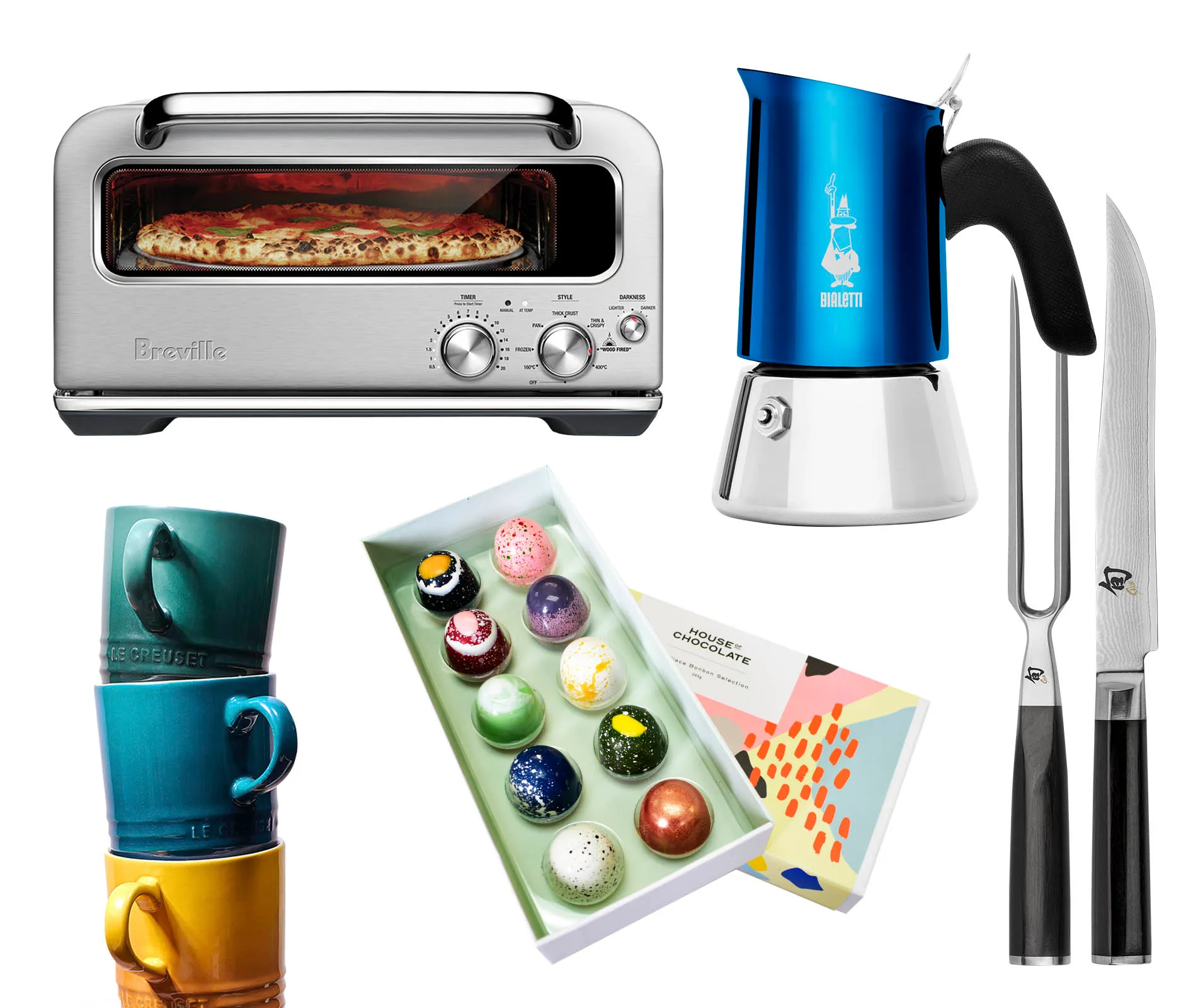Clockwise from top left: Breville the Smart Pizzaiolo, $999, from Noel Leeming. Limited edition 4-cup stovetop espresso maker in venus blue, $110, from Bialetti. Two-piece carving set, $499, from Kai Shun. 10-piece bonbon selection, $36, from House of Chocolate. Botanique mugs, $130 (four), from Le Creuset.