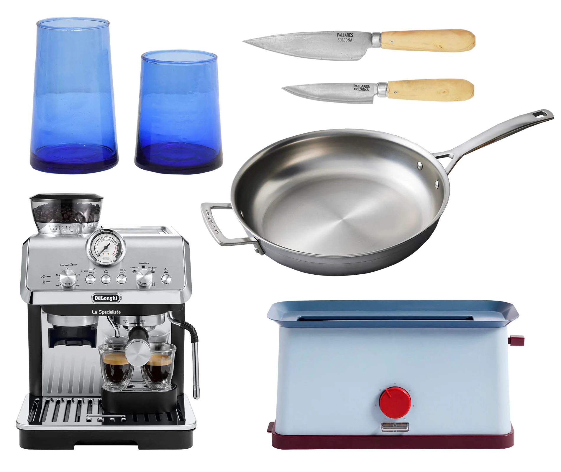 Clockwise from top left: Beldi tapered wine glasses in cobalt, $13 (large) and $13.50 (champagne), from Father Rabbit. Pallares Solsona kitchen knives, from $50, from Father Rabbit. 28cm stainless steel frying pan, $320, from Le Creuset. Hay Sowden toaster, $169, from End. LaSpecialista Arte espresso coffee machine, $899, from De’Longhi.