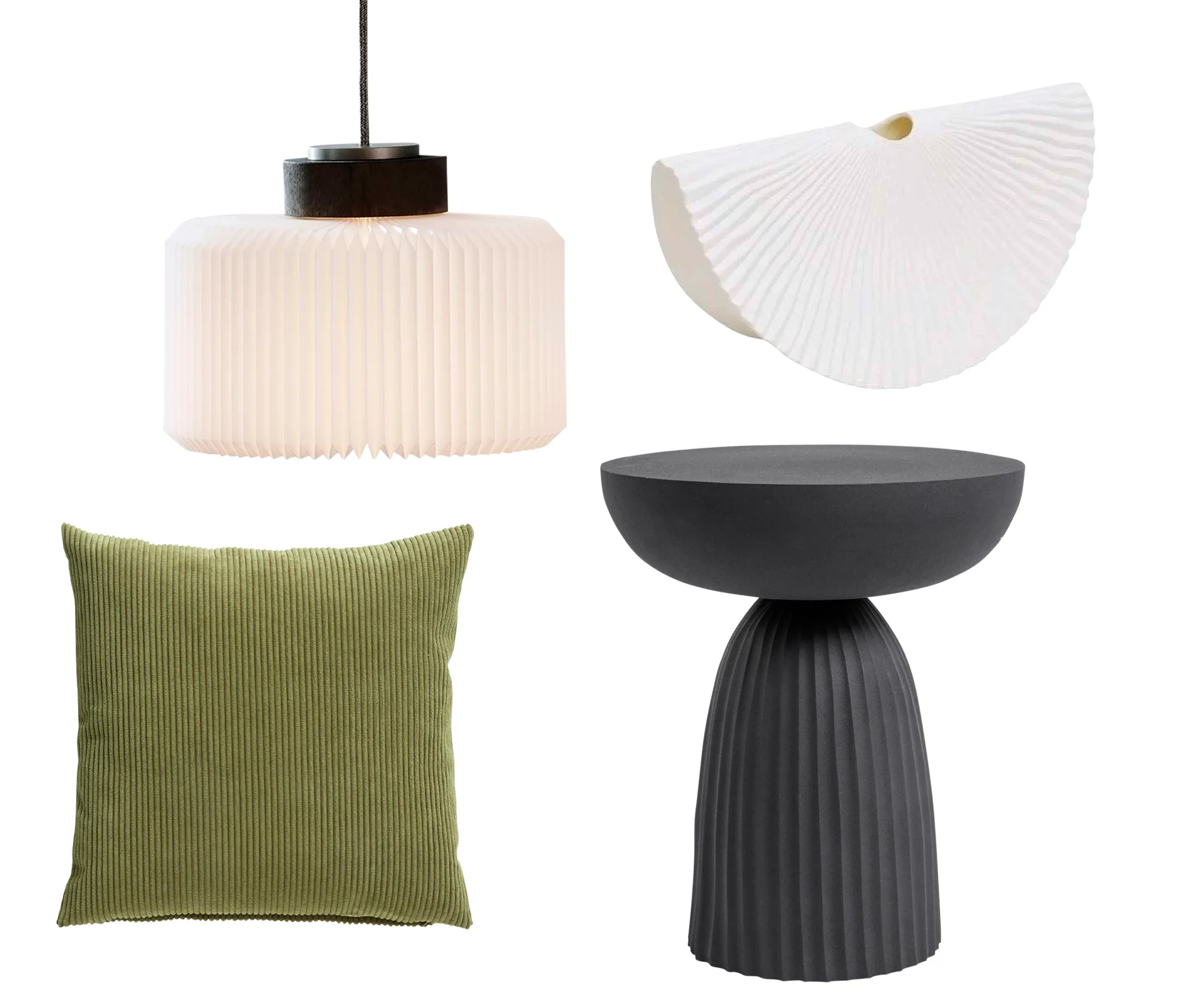 Clockwise from top left: Le Klint cylinder 183 pendant in black oak, $1074 (medium), from Finnish Design Shop. Pleated folded swing vase in white, $102, from The Design Depot. Expose side table, $629, from BoConcept. Cord cushion in green, $79, from BoConcept.