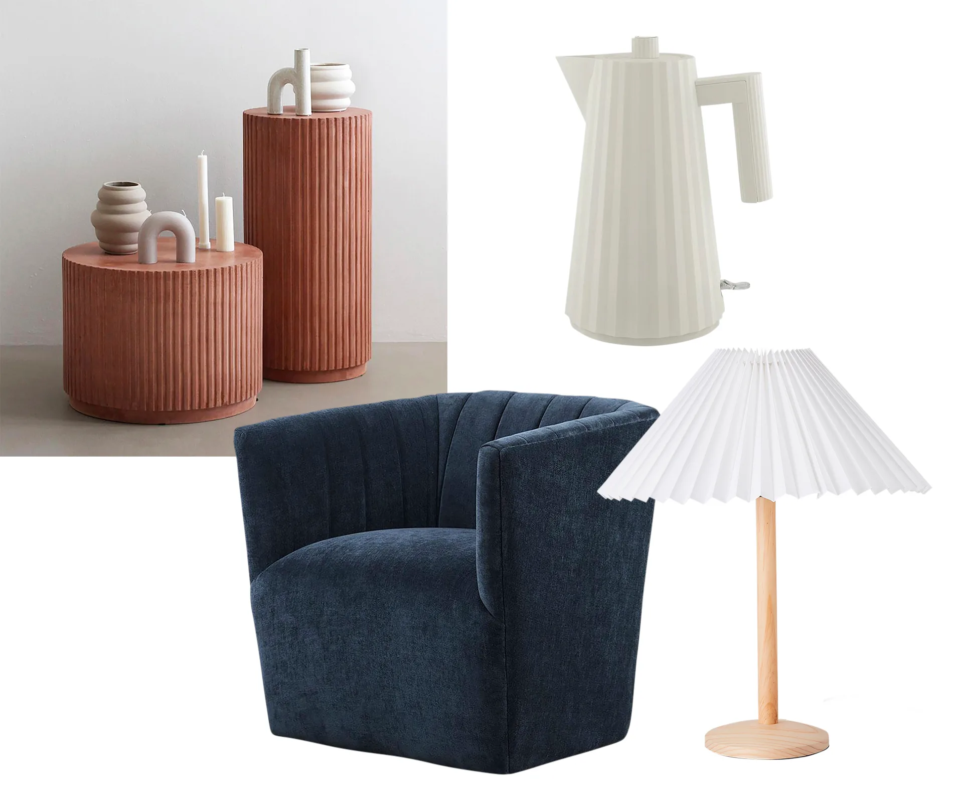 Clockwise from top left: Broste Rillo table and pedestal in terracotta, $559.99 each, from A&C Homestore. Alessi Plisse kettle in white, around $260, from Living by Design. Lena pleat lamp, $27, from Kmart. Humble & Grand swivel armchair in moonlight, $1499.99, from The Market.