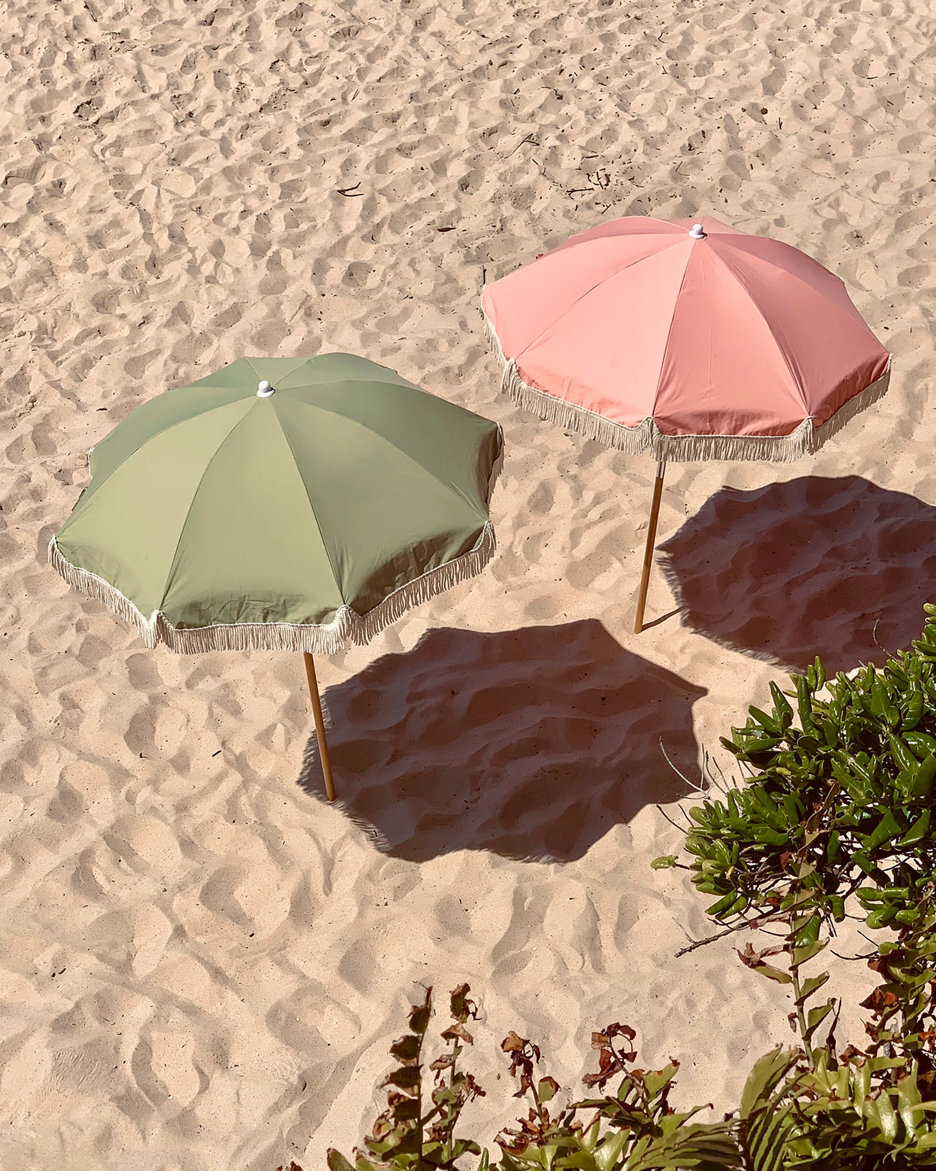 Sunny Life luxe beach umbrella in powder pink and olive, $199 each, from Shut The Front Door.