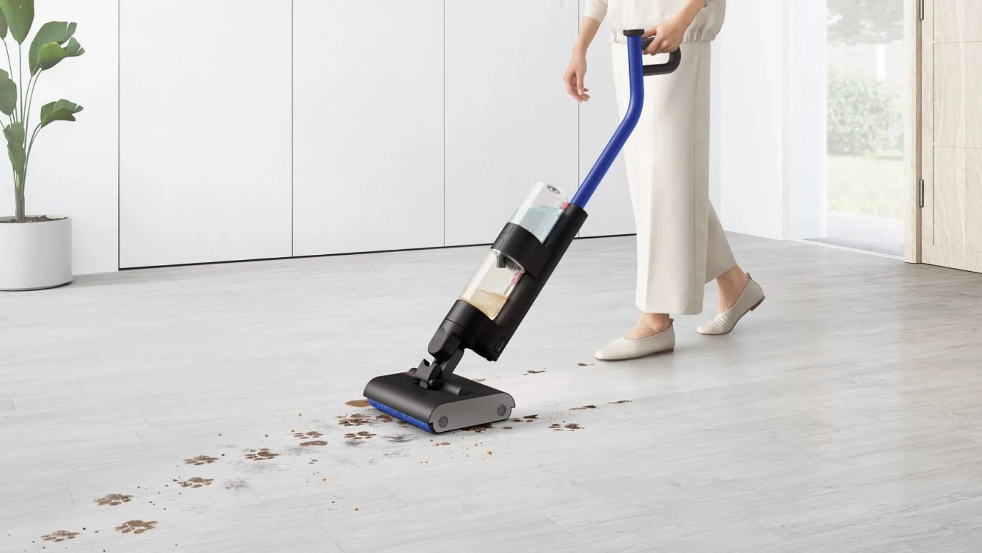 Essentially, yes. Instead of first vacuuming (to pick up debris) and then mopping (to wash), with the WashG1 you can do it all in a single pass. A mesh tray collects food and dry debris, ready to be emptied afterwards. Dirty liquid is immediately pumped through to the water tank. Meanwhile, water from the clean tank flows over the roller heads and is distributed evenly across the floors. If you’ve seen a Bissel or Rug Doctor in action, the two-chamber system will make sense.